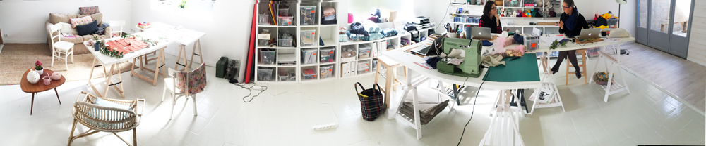 Et dans ce cocon lumineux, 8 à 10 fois par an, nous passons « en mode créatif ». Nous sortons les matériaux repérés en amont, les envies, les carnets de notes et de croquis. On sort tout, dans tous les sens du terme, car on régurgite aussi tout ce que l’on a accumulé dans nos têtes. Si tu passes dans l’atelier à ce moment-là, tu auras clairement l’impression de déranger. Se tourneront vers toi 2 paires d’yeux avec un regard absent et des sourcils froncés au milieu d’un bazar sans nom. Alors que nous sommes volontiers bavardes et que nous aimons montrer nos projets, à ce stade, celui de la gestation, notre concentration nous rend quasiment mutiques pour le monde extérieur et la dernière chose dont nous avons envie c’est de montrer le travail en cours, totalement en friche.