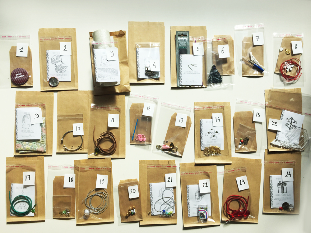 Chaque kit peut contenir de 8 à 20 éléments pour les plus grands et se décline en 5 à 7 couleurs, c’est donc 30 à 50 articles différents à commander pour chaque édition. Pour certains il va aussi falloir mettre en place un processus de transformation : découpe des tissus, rubans, élastique ; pliage ; mise en sachet de perles, boutons, petits éléments…