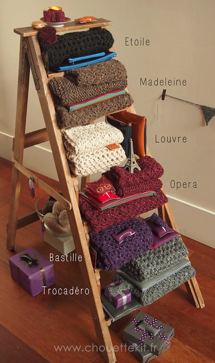 Cette édition de Noël, Chouettekit n°8, contient : 1 pelote (xl +2), 2 coupons de simili cuir de couleurs différentes d’environ 18 x 28 cm (xl +1), 1 crochet, 2 écheveaux de coton à broder de 10m (xl +2), 1 masking tape (xl +1), 1 sachet de perles et apprêts métallisés (xl +1),1 ruban pailleté, 1 zip (xl + 1 plus petit), et bien sûr, un petit cadeau surprise (xl +1), ces matériaux déclinés en six gammes couleurs plus deux compositions de trio : un “neutre” Tuilerie et un “coloré” Montmartre.