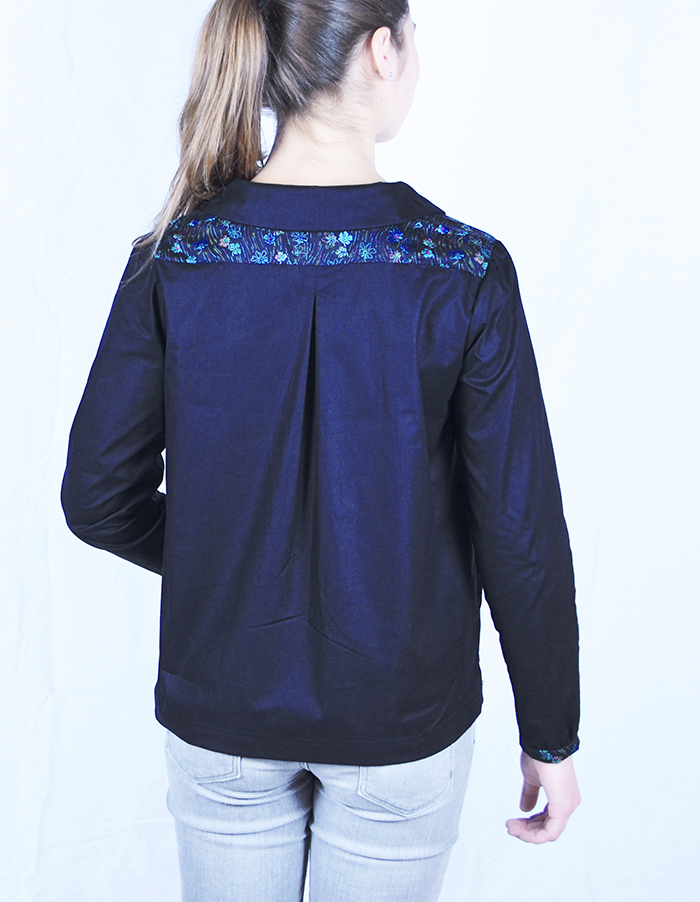 Version manches longues, poignets légèrement froncés, col et empiècement épaule, fronces poitrines, pli creux dans le dos.