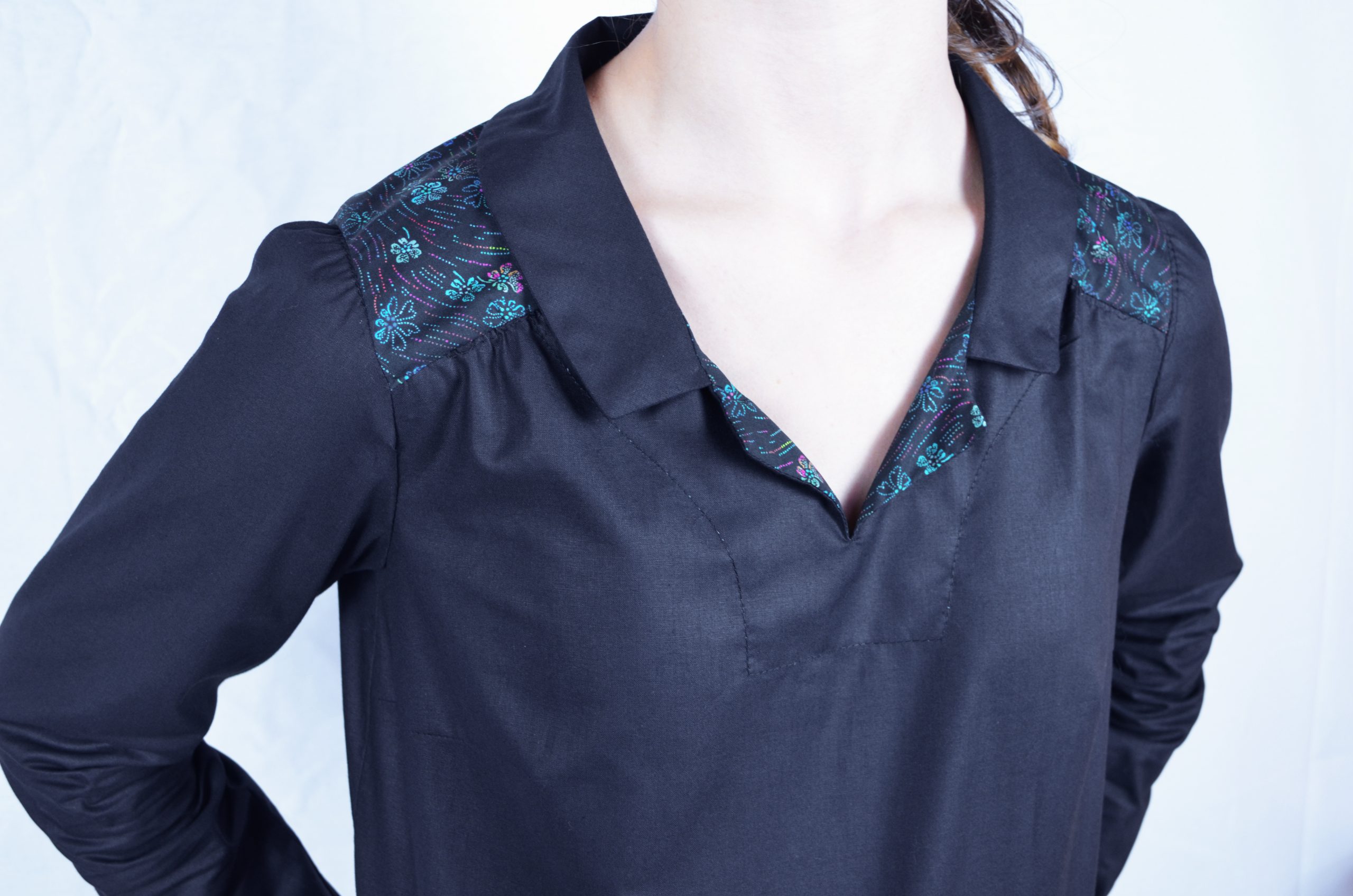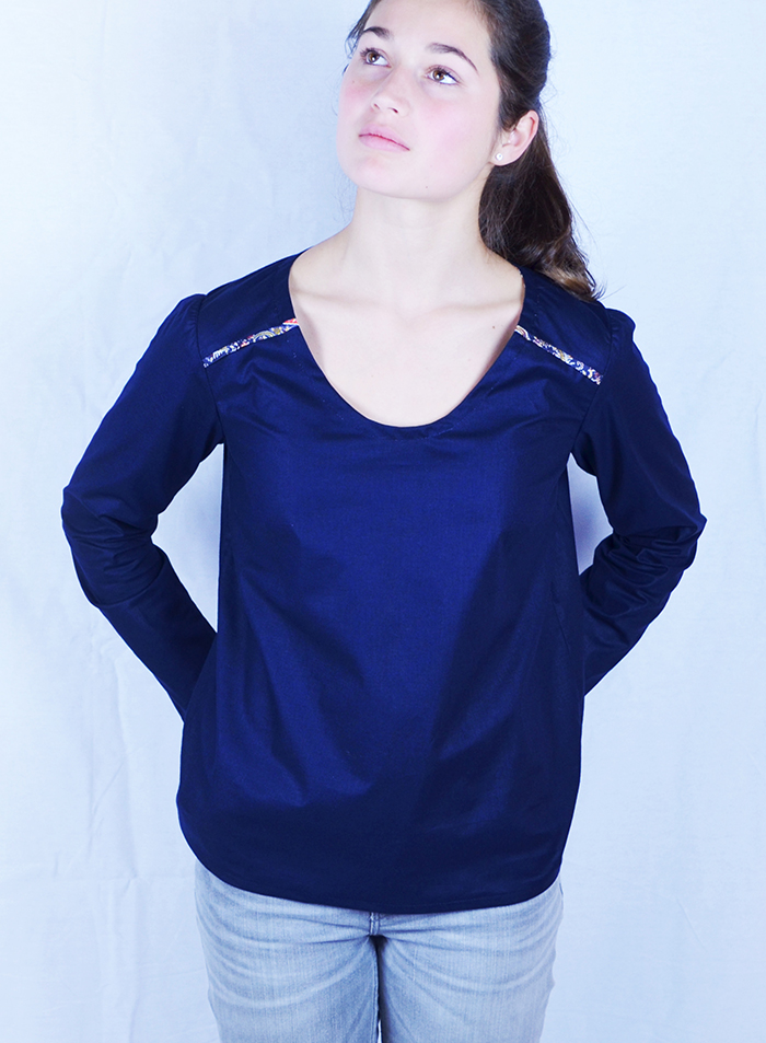 Version simplifiée : manches longues finition biais Liberty intérieur, encolure ronde finition biais Liberty intérieur, dos sans pli creux et sans empiècement épaule, faux passepoil Liberty et pas de fronces poitrines.