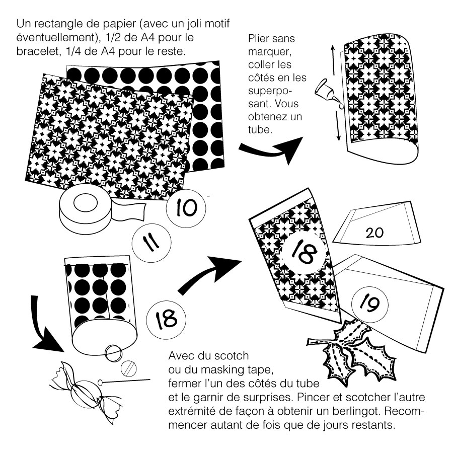 Pour les réaliser, il vous faut : des feuilles de papier, du scotch ou du masking tape, de la colle (plutôt bâton), des gommettes rondes et un feutre pour faire les numéros, des ciseaux et bien-sûr de quoi garnir les berlingots.