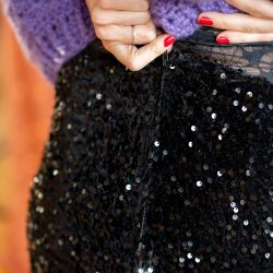 Ce projet est accessible, la pose du zip restant peut-être ce qui peut effrayer le plus, mais notez que le tissu maille sequins sélectionné nécessite davantage de minutue. Prendre le temps nécessaire de la lecture des explications avant d’attaquer la réalisation est la garantie de réussir le montage de cette jupe sans encombre ! Nous conseillons également de réaliser la jupe dans sa version la plus simple à savoir sans les poches et sans la ceinture montée (mais avec parementure, que vous pouvez d’ailleurs choisir de coudre dans un coton noir de votre stock pour davantage de confort).