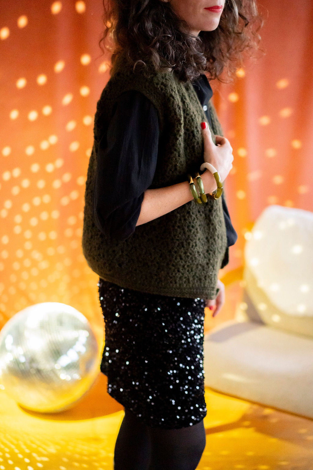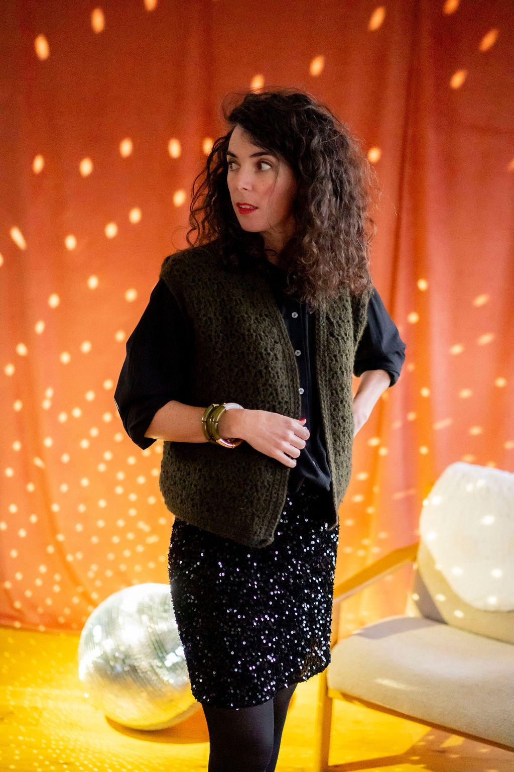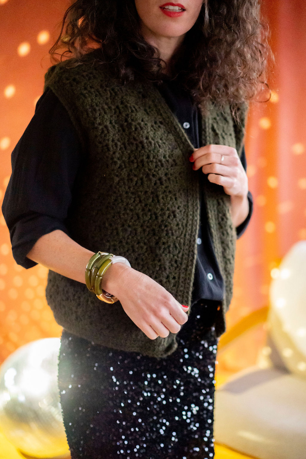 Le coeur du gilet est composé de grannies mais on vient ensuite structurer le gilet et travailler les détails avec des jolis points tantôt denses tantôt ajourés. Le résultat est vraiment séduisant et super chaud.