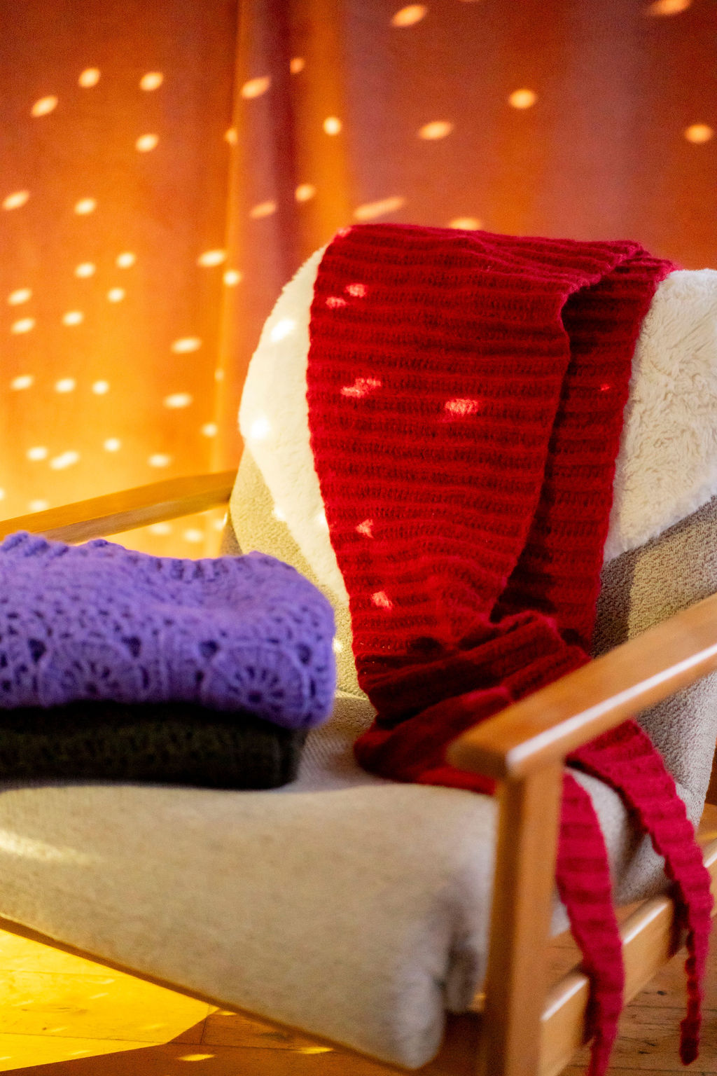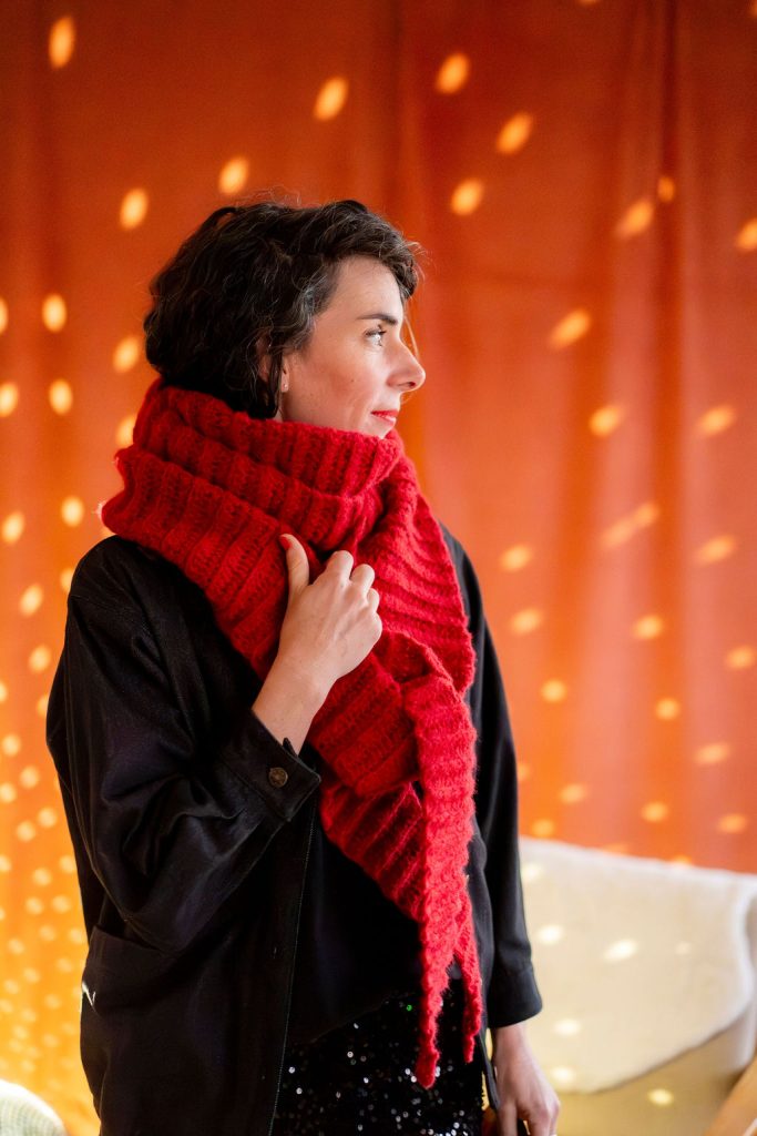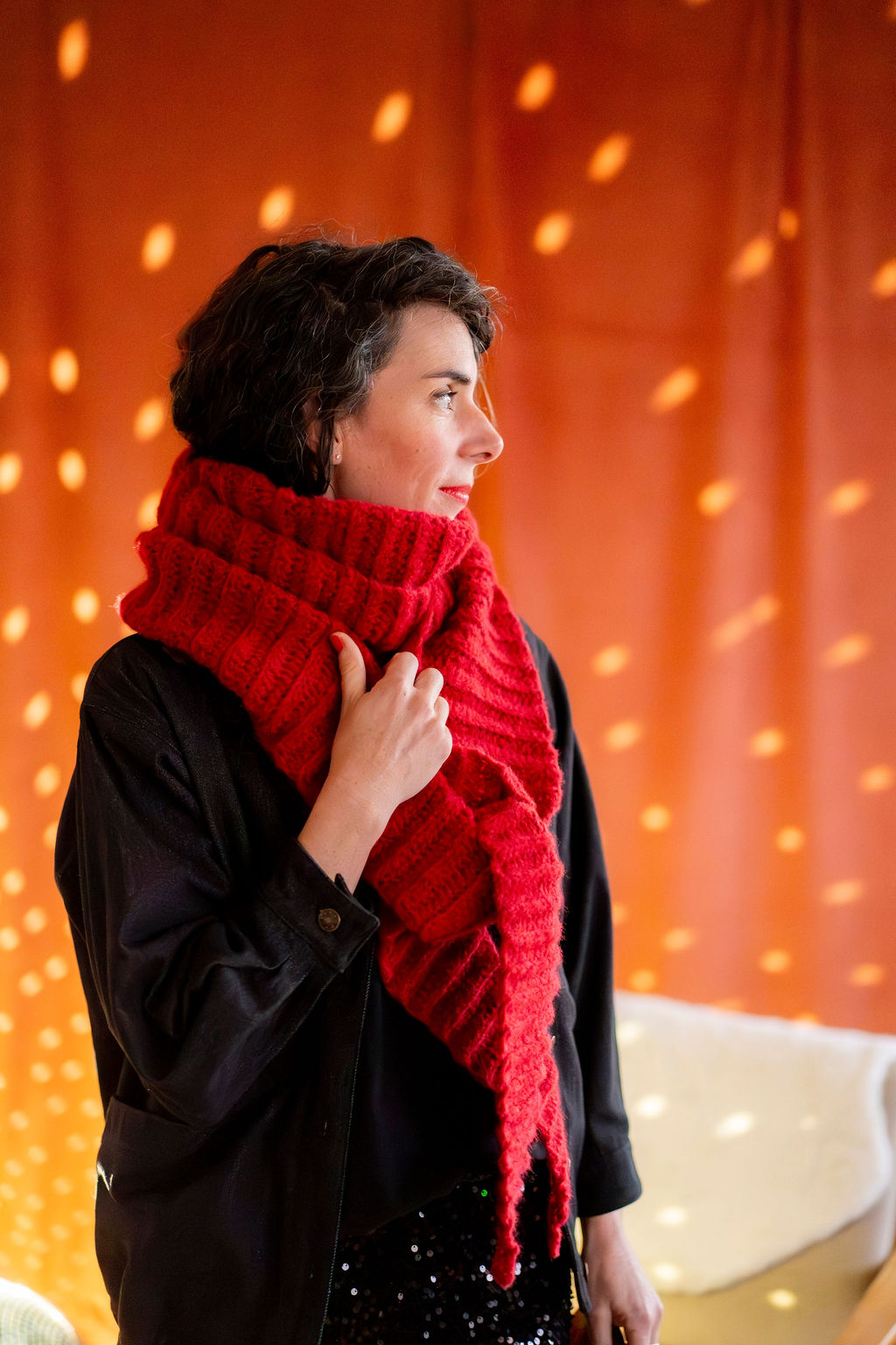 Une loooooongue pointe au crochet comme un triangle très étiré, plutôt étroite et bien longue, très dans l’air du temps. Une forme basique, moderne et facile à porter. On utilise les effets de côtes au crochet pour un rendu proche du tricot et notre fil super doux.