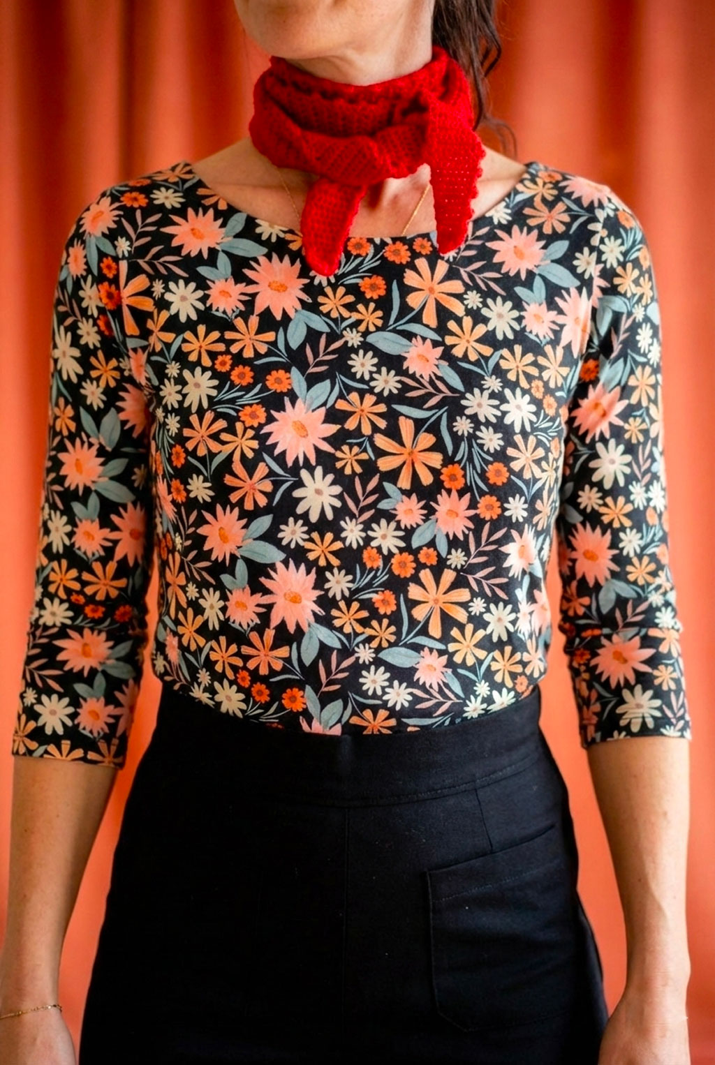 Plusieurs options s’offrent à vous : vous pouvez le réaliser avec des manches courtes, 3/4 ou longues, l’encolure devant est au choix arrondie ou bateau, et l’entrejambe peut être fermé avec des pressions ou cousu façon maillot de bain. De plus, ce modèle a été dessiné pour être également déclinable en tee-shirt pour celles qui n’aiment pas les bodies.