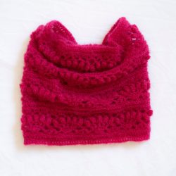 Pour ce col on associe pas mal de points différents : les mailles serrées, les brides, et vous apprendrez aussi une sorte de noppe que l’on aime beaucoup : le point bubble !
