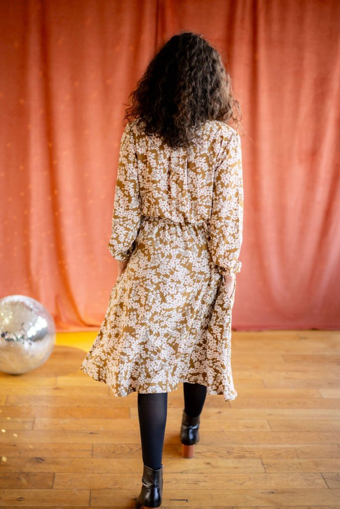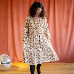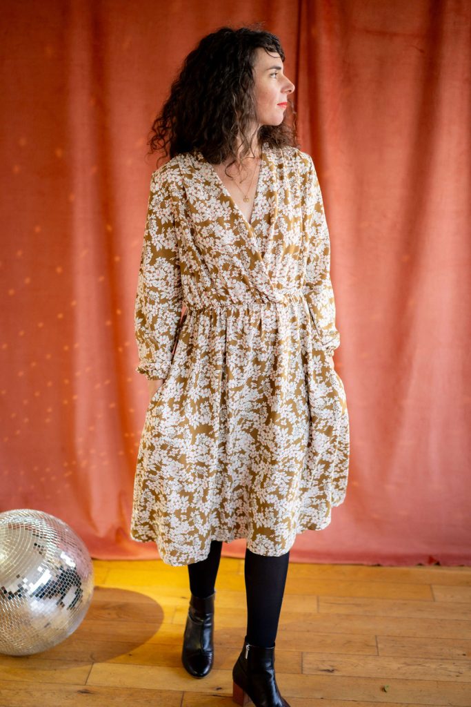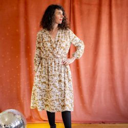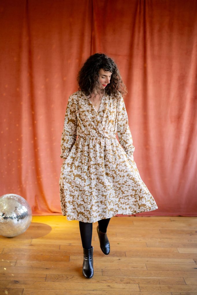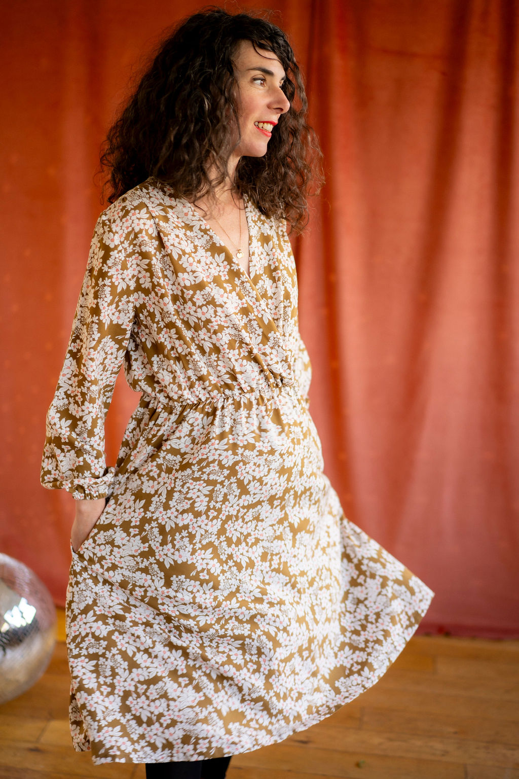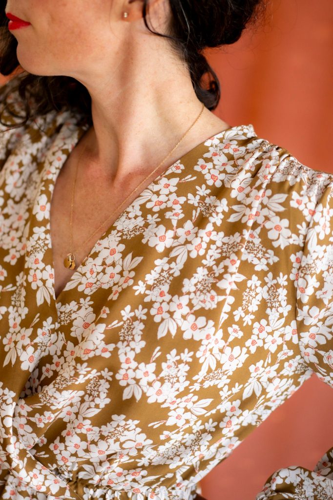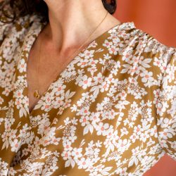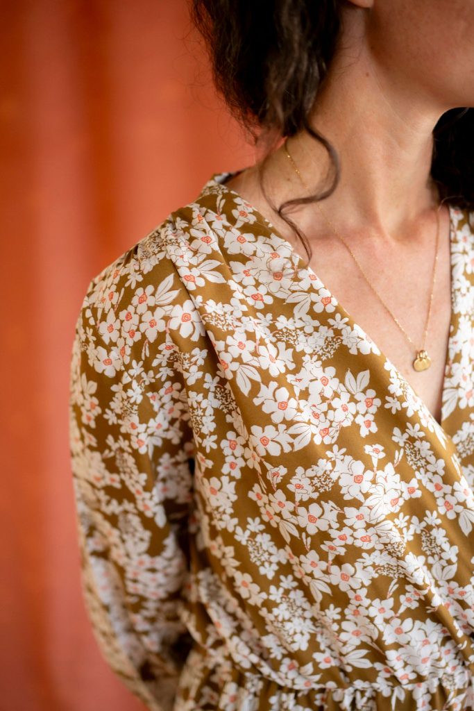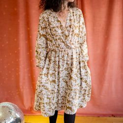 La robe Elena version corsage simple est très facile à monter, et la version corsage croisé a été pensée pour se coudre aisément également. La viscose est fluide et nécessite de bien épingler ou bâtir à chaque étape.