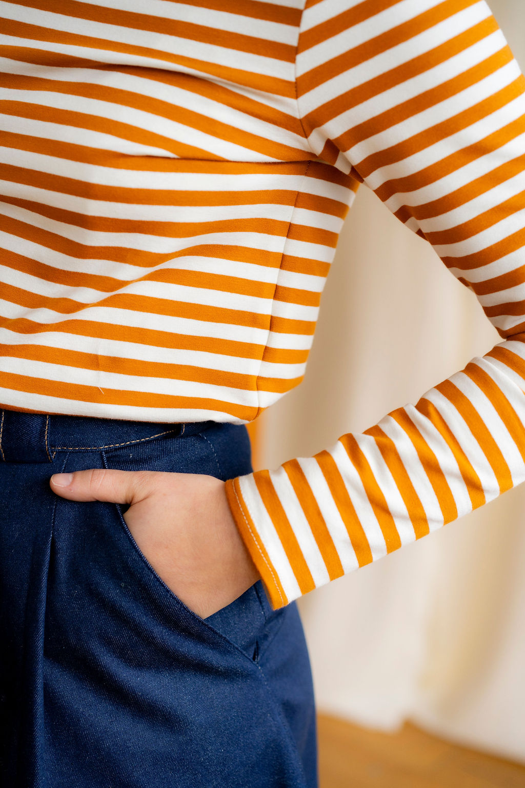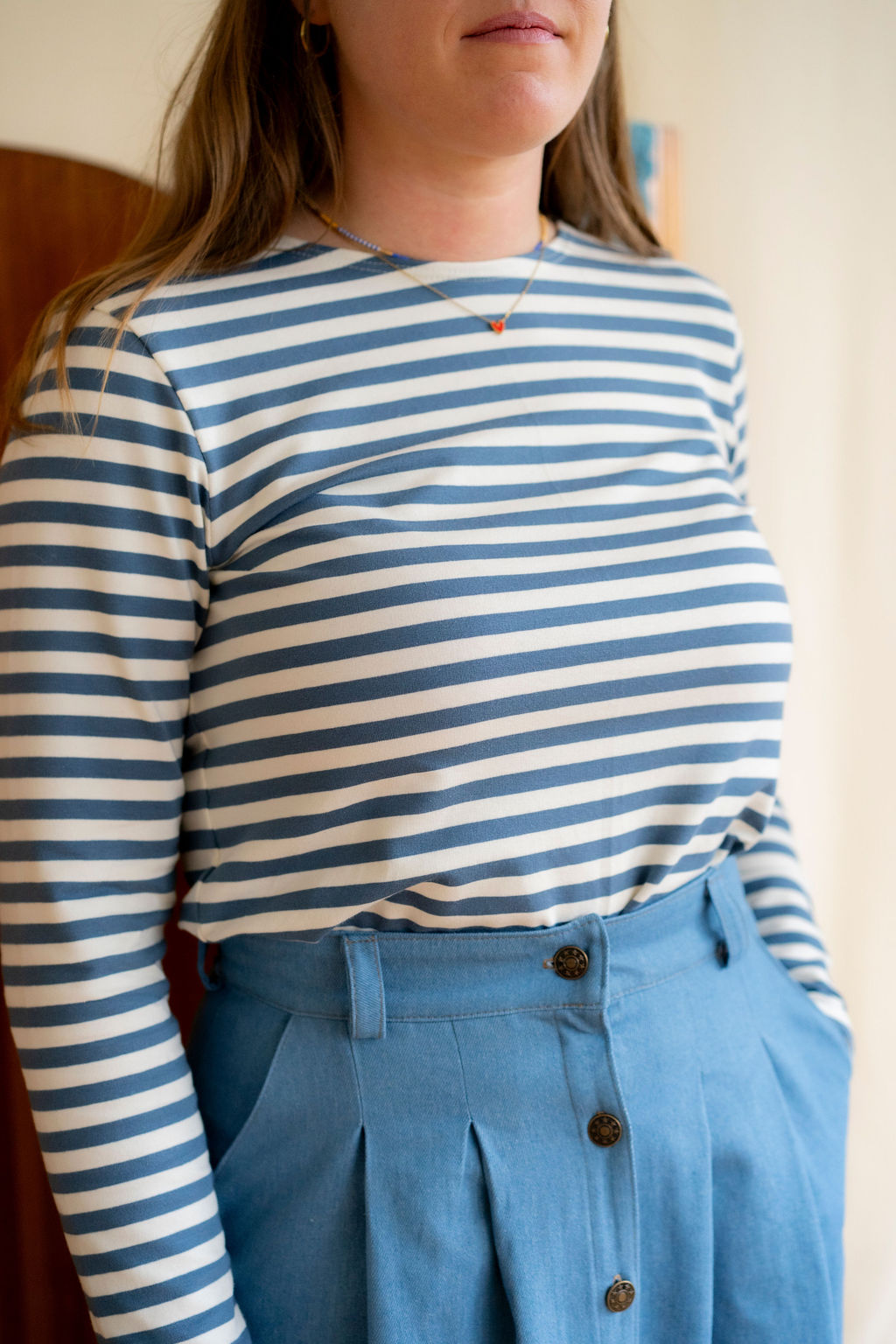 Ce modèle a été pensé pour être très facile à monter et ne présente aucune grande difficulté. Le rentré au niveau de l’encolure demande de bien épingler, mais c’est là la seule difficulté. Les pièces s’assemblent facilement, le tissu est facile à coudre et ne glisse pas.
