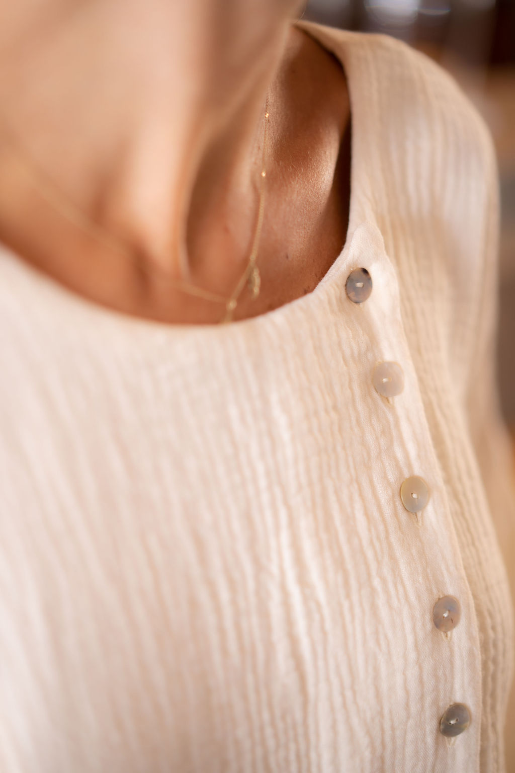 Cette blouse confortable et originale sera parfaite aussi bien au quotidien que pour vos sorties et autres moments festifs. La double gaze douce et moelleuse que nous avons sélectionnée est agréable à travailler et à porter.