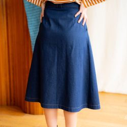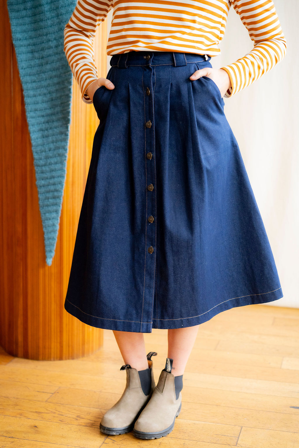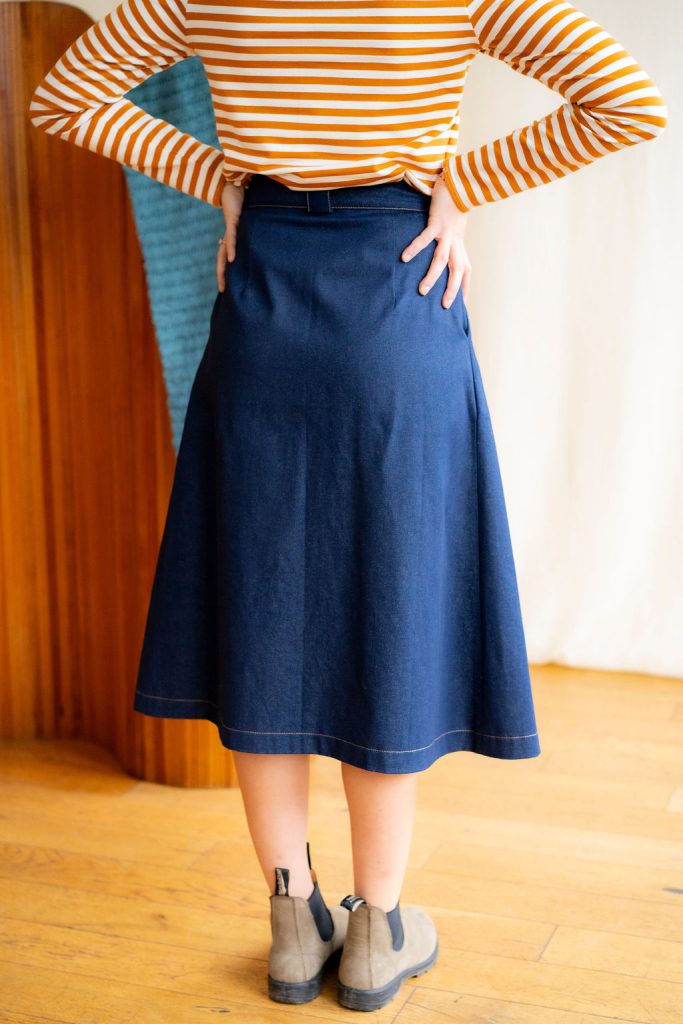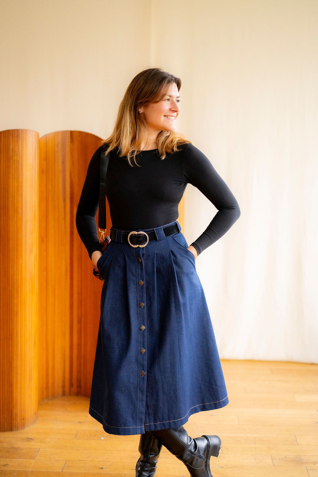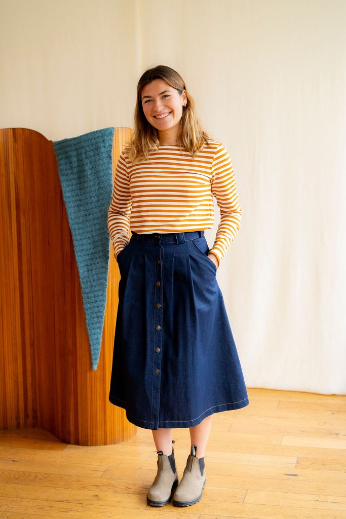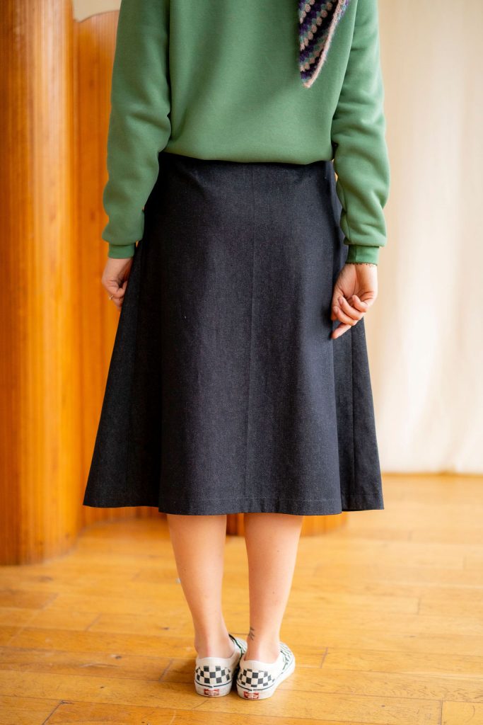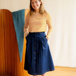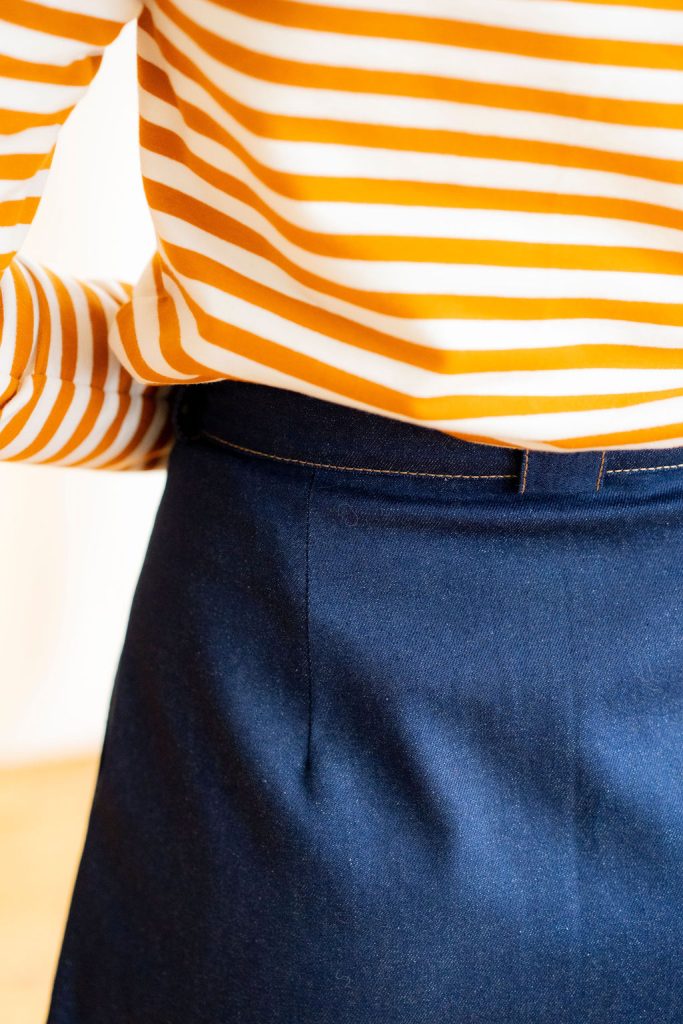 C’est une jupe qui devient vite un classique de garde-robe, et le denim 100 % coton sélectionné est agréable à travailler comme à porter.