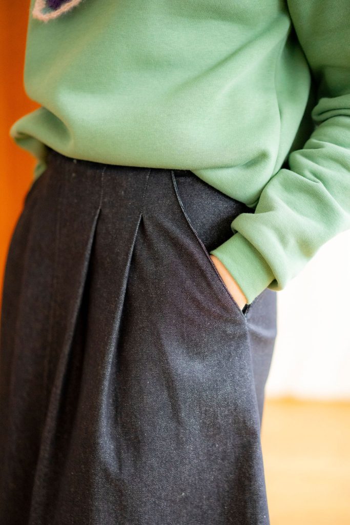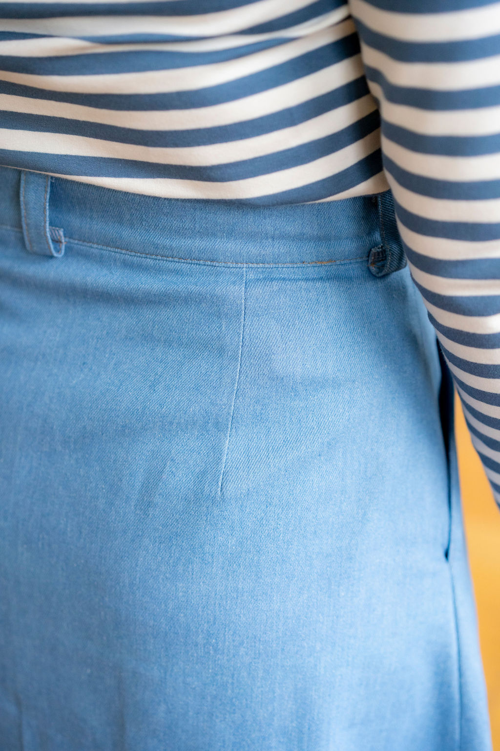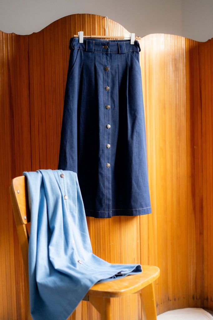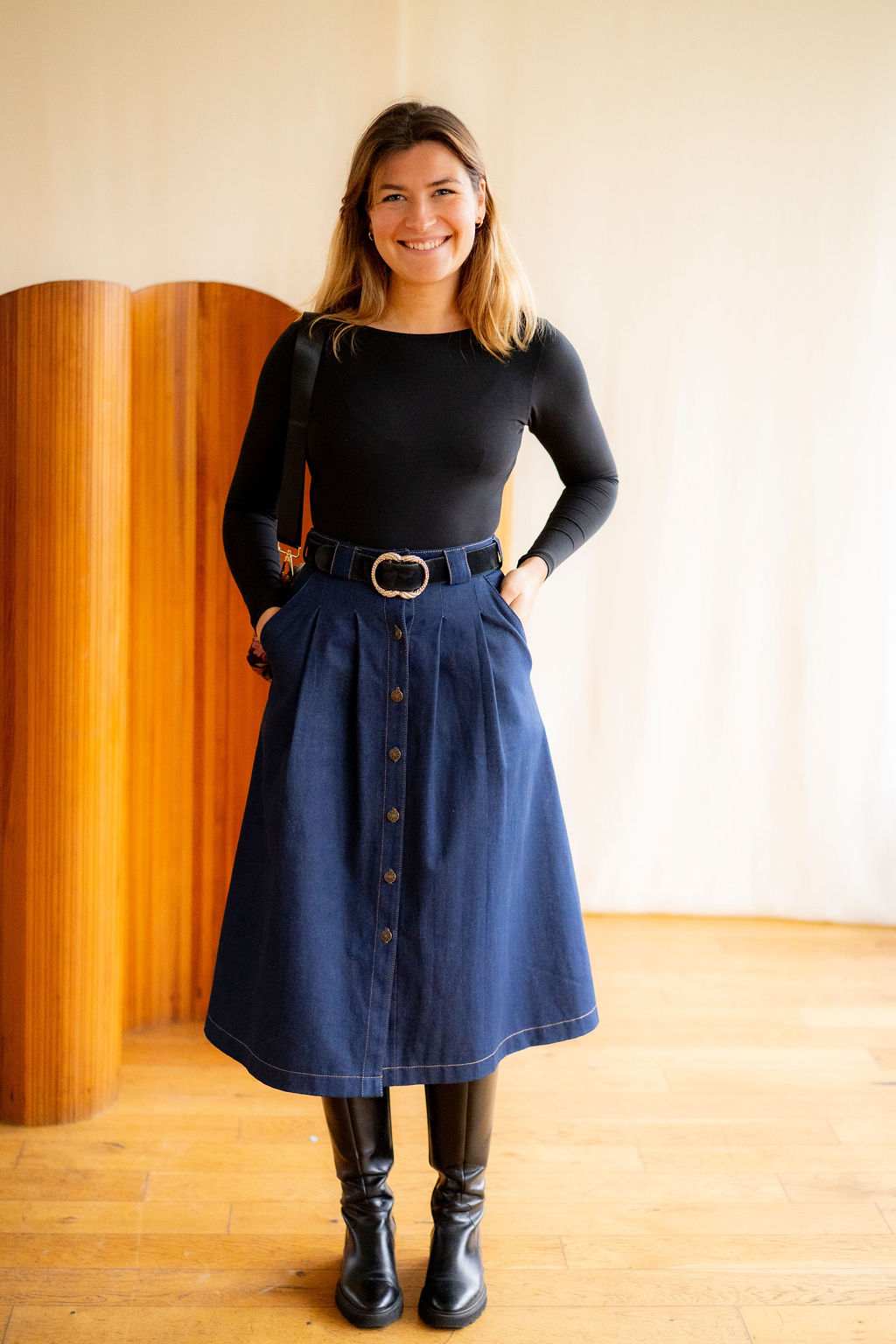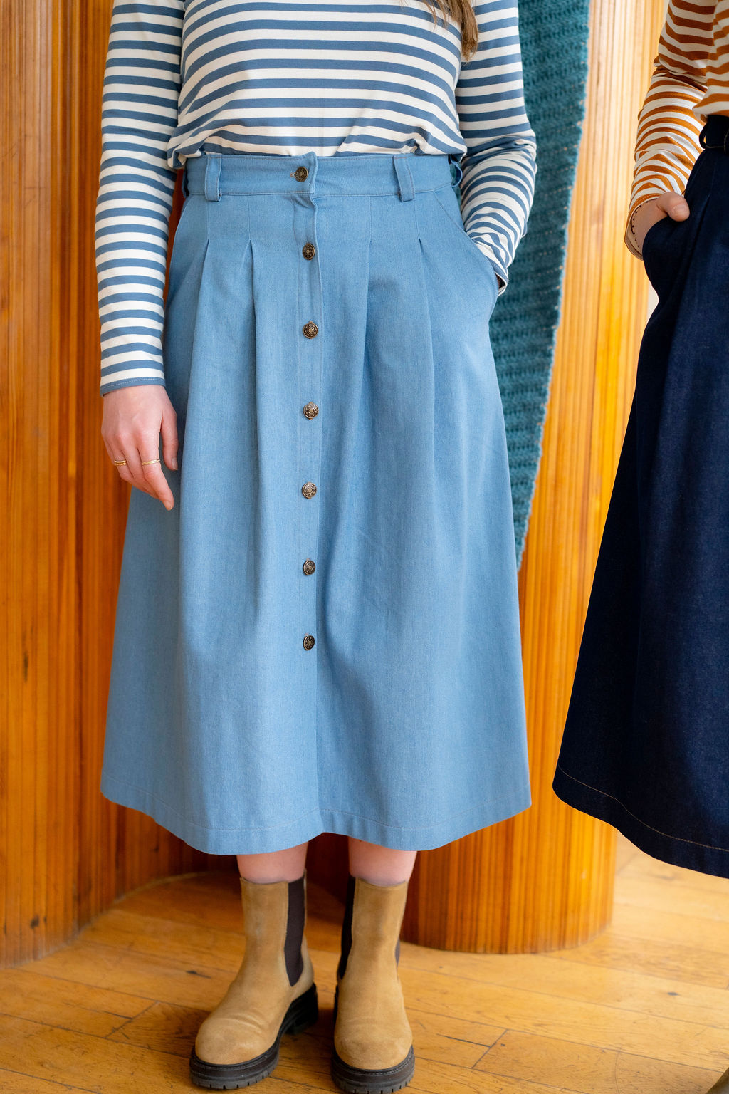 C’est une jupe qui devient vite un classique de garde-robe, et le denim 100 % coton sélectionné est agréable à travailler comme à porter.
