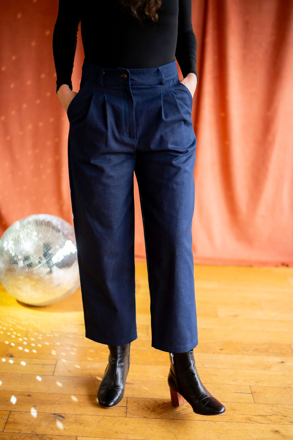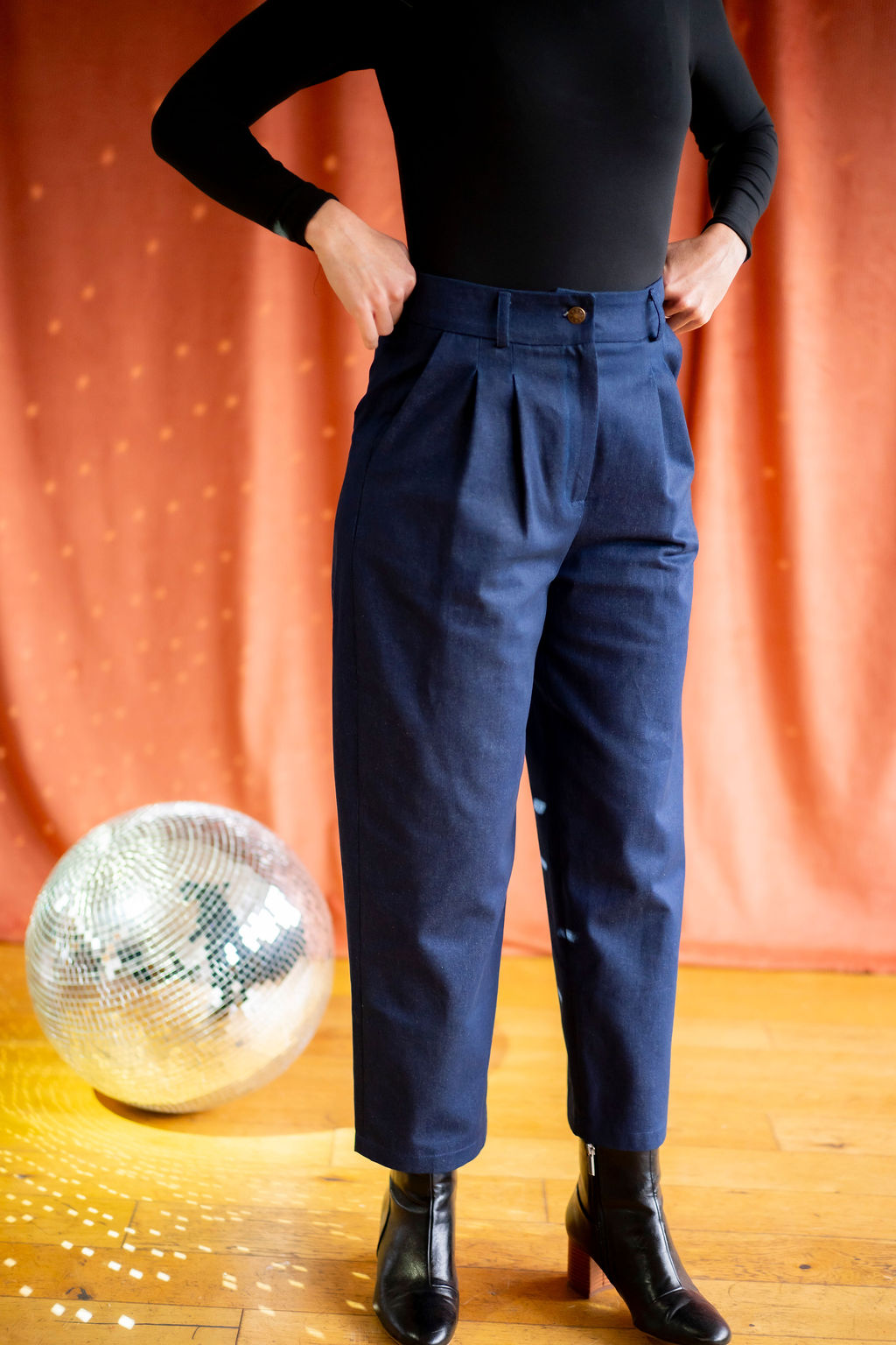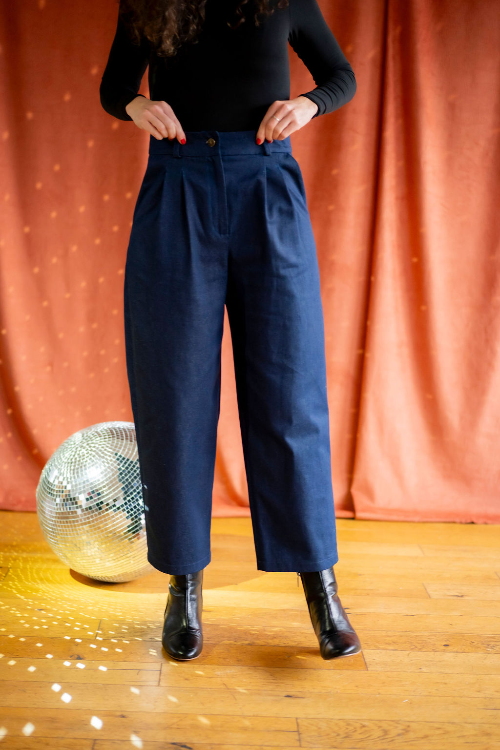 Nous sommes reparties d’un modèle plutôt classique mais toujours efficace, le pantalon à pinces. André a une taille haute et un bassin ajusté grâce au jeu de pinces devant et dos, ainsi que des poches italiennes sur le devant. Des passants de ceinture viennent finir le projet. Une coupe très élégante, facile à porter et combiner. Nous vous le proposons ici dans plusieurs versions, toutes expliquées dans un seul et même patron :