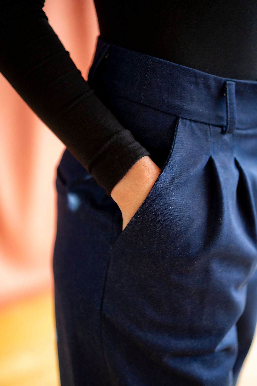 Pour les couturiè·res averti·es, ou qui souhaiteraient progresser en se frottant à de nouvelles techniques, nous vous proposons également une version avec une véritable braguette sur le milieu devant du pantalon. Il est également possible de coudre une ou deux poches passepoilées au dos : élément technique mais hautement satisfaisant une fois maitrisé !