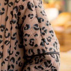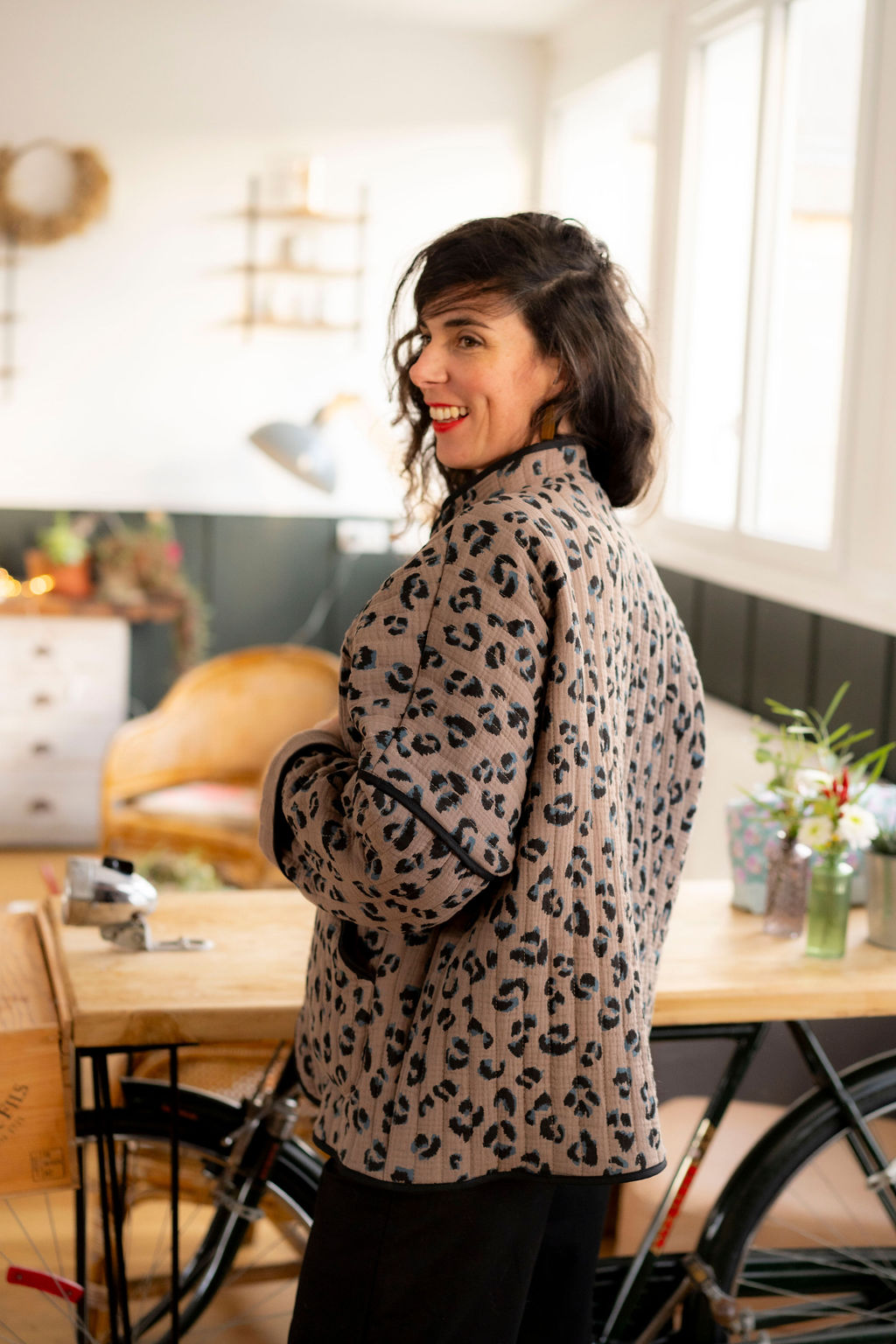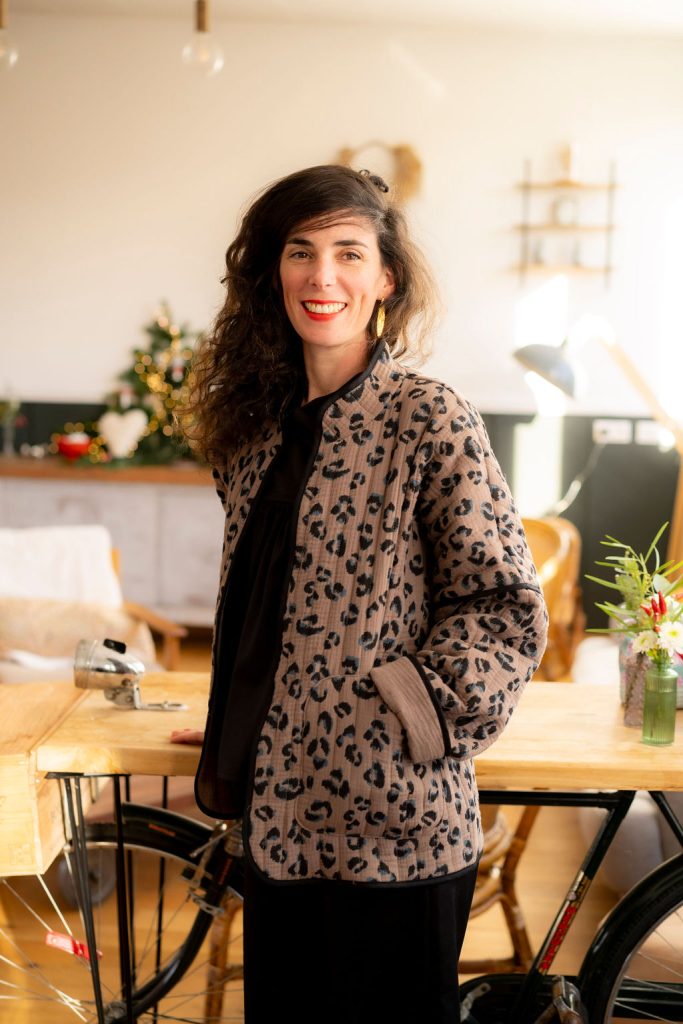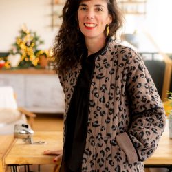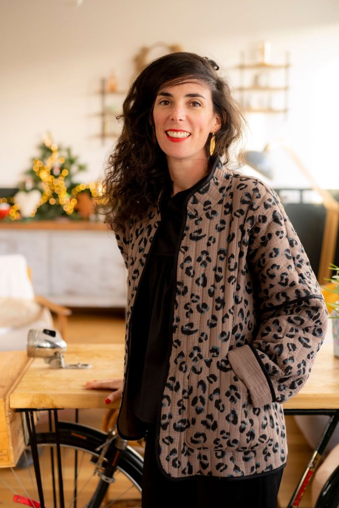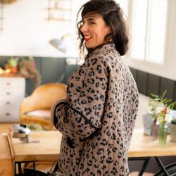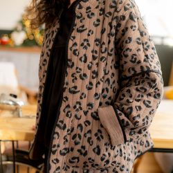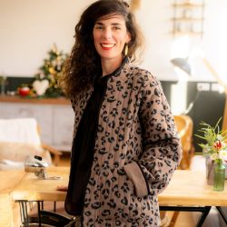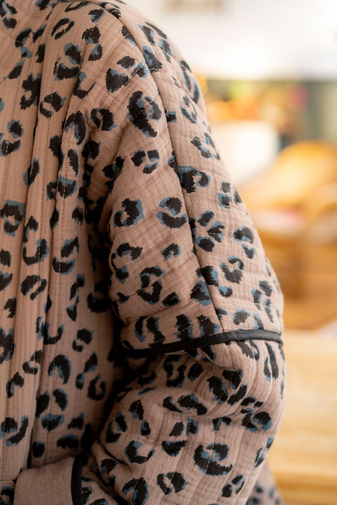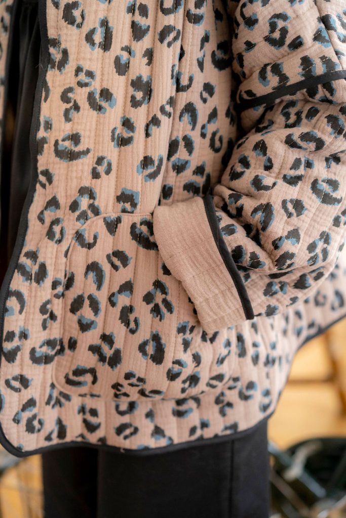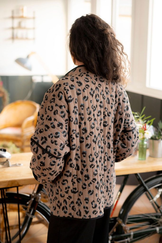 Pour cette nouvelle version de Kim, nous avons choisi un tissu réversible déjà matelassé, pour un gain de temps appréciable dans la réalisation de votre veste, avec un motif léopard des plus tendances. Pour rendre notre veste réversible malgré l’absence de doublure, nous avons joué avec le biais pour masquer les coutures. À vous de choisir quel côté du tissu vous souhaitez porter avec le biais masquant les coutures. Résultat ? Une touche d’originalité supplémentaire pour notre veste Kim !