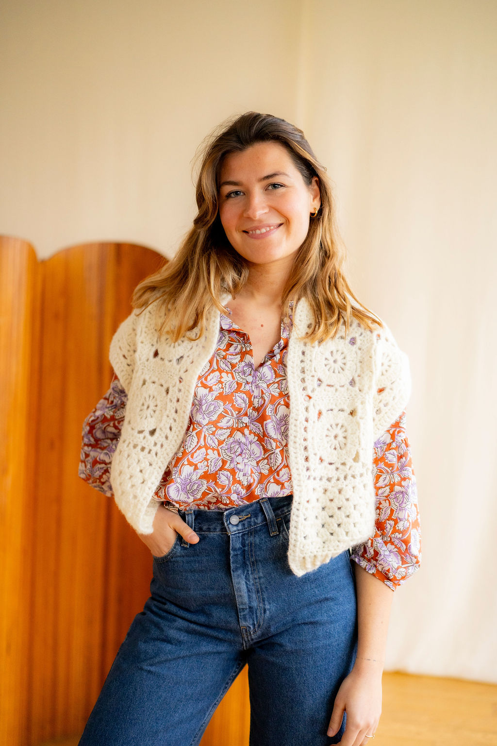 Le gilet Basile est un projet spectaculaire, qui combine plusieurs points au crochet et des grannies. C’est un projet dont on avait très envie, et que l’on a adoré développer dans cette superbe laine, à la fois épaisse et légère.