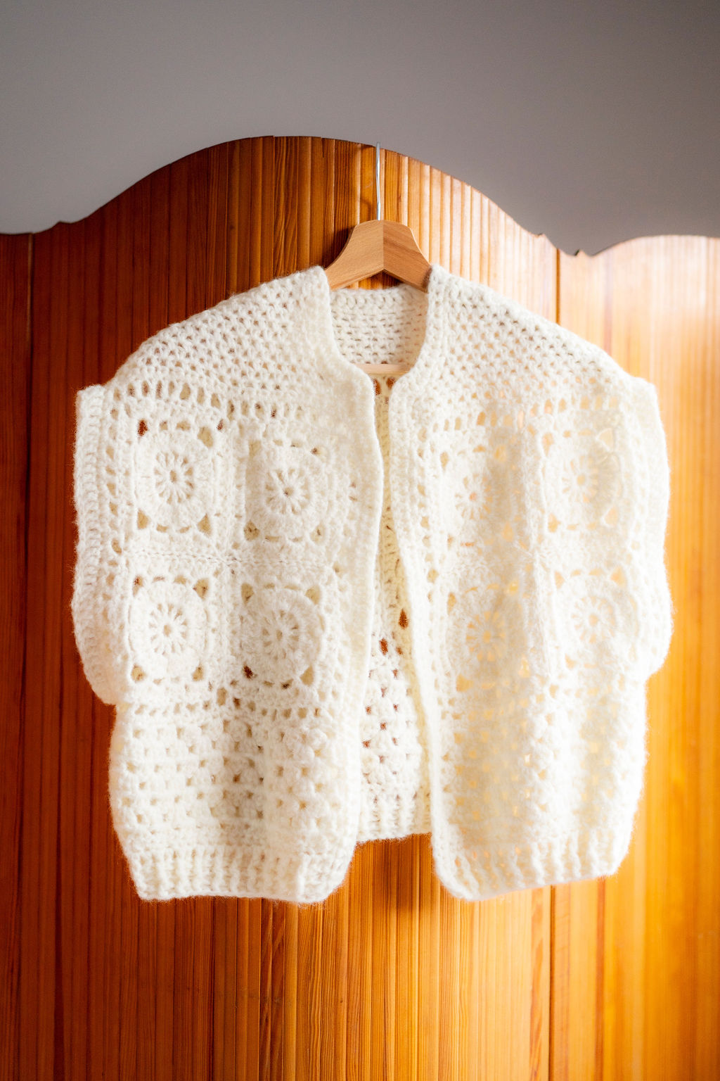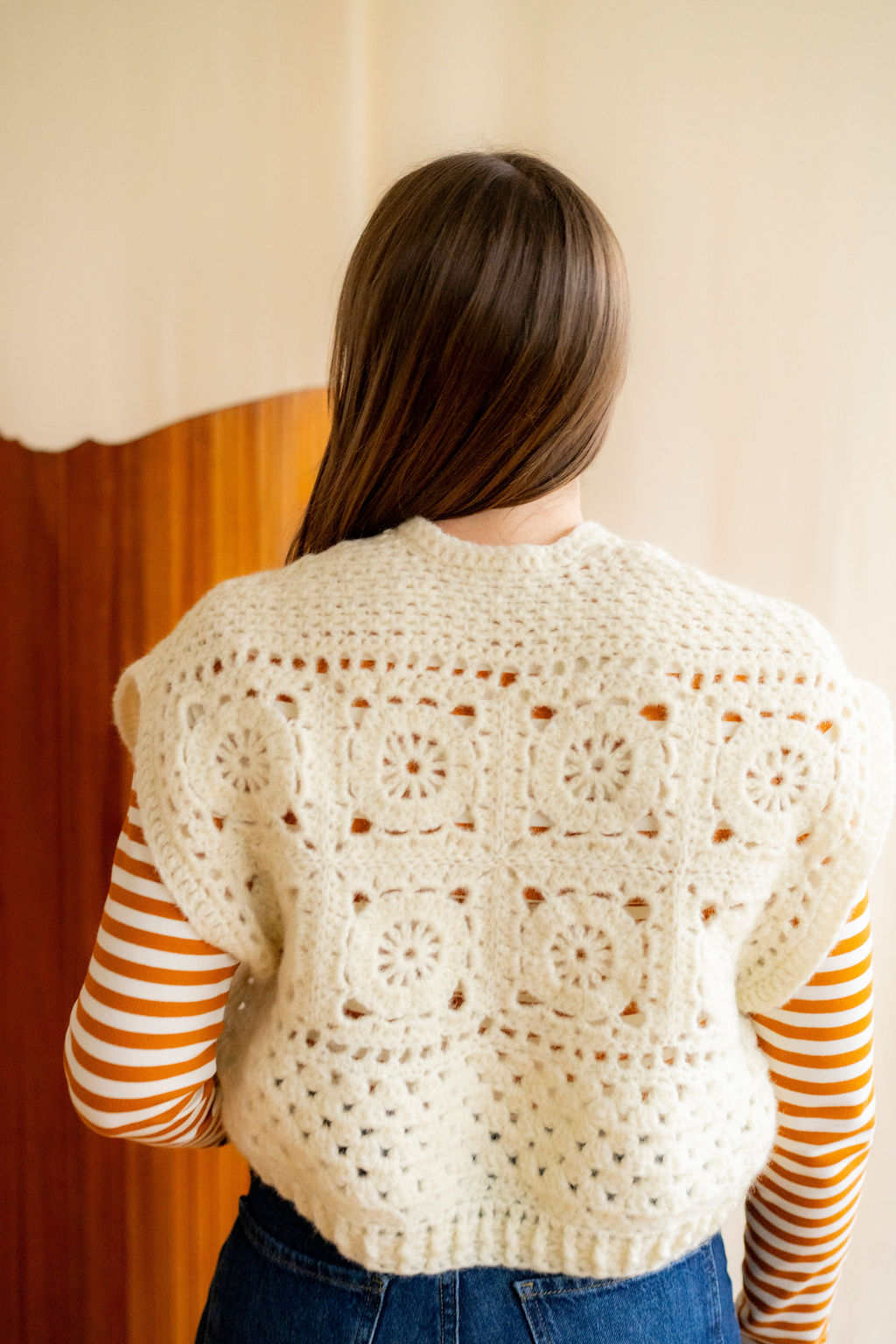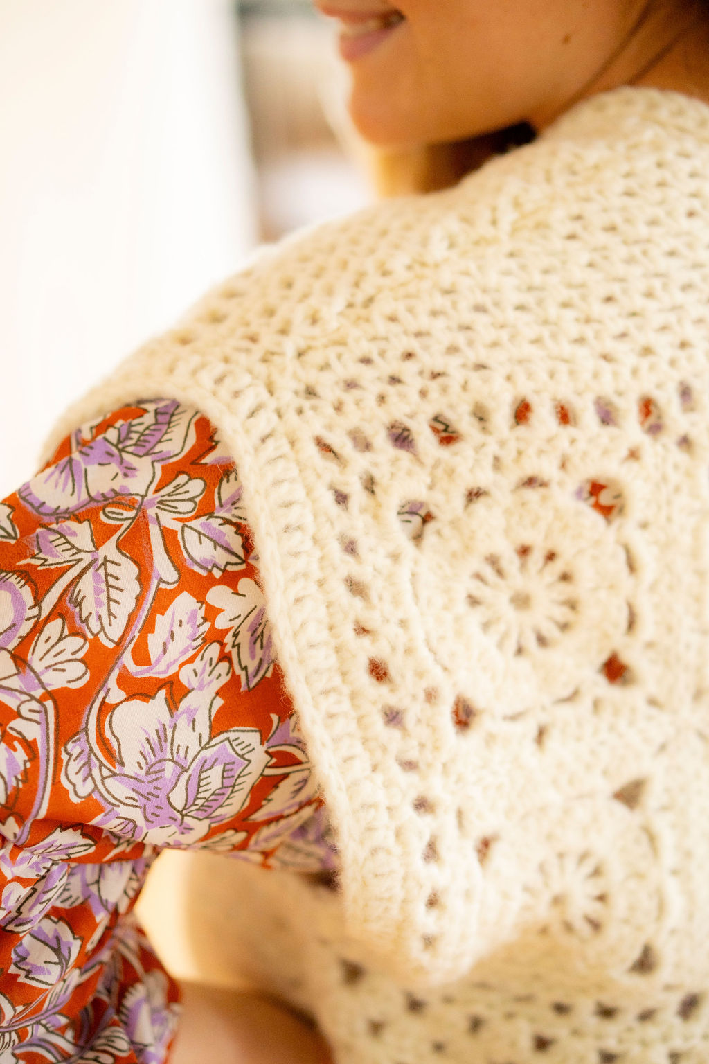 Le cœur du gilet est composé de grannies, puis la pièce est structurée avec un travail mêlant points denses et points ajourés. Le résultat est vraiment séduisant, très chaud, et offre une belle tenue.