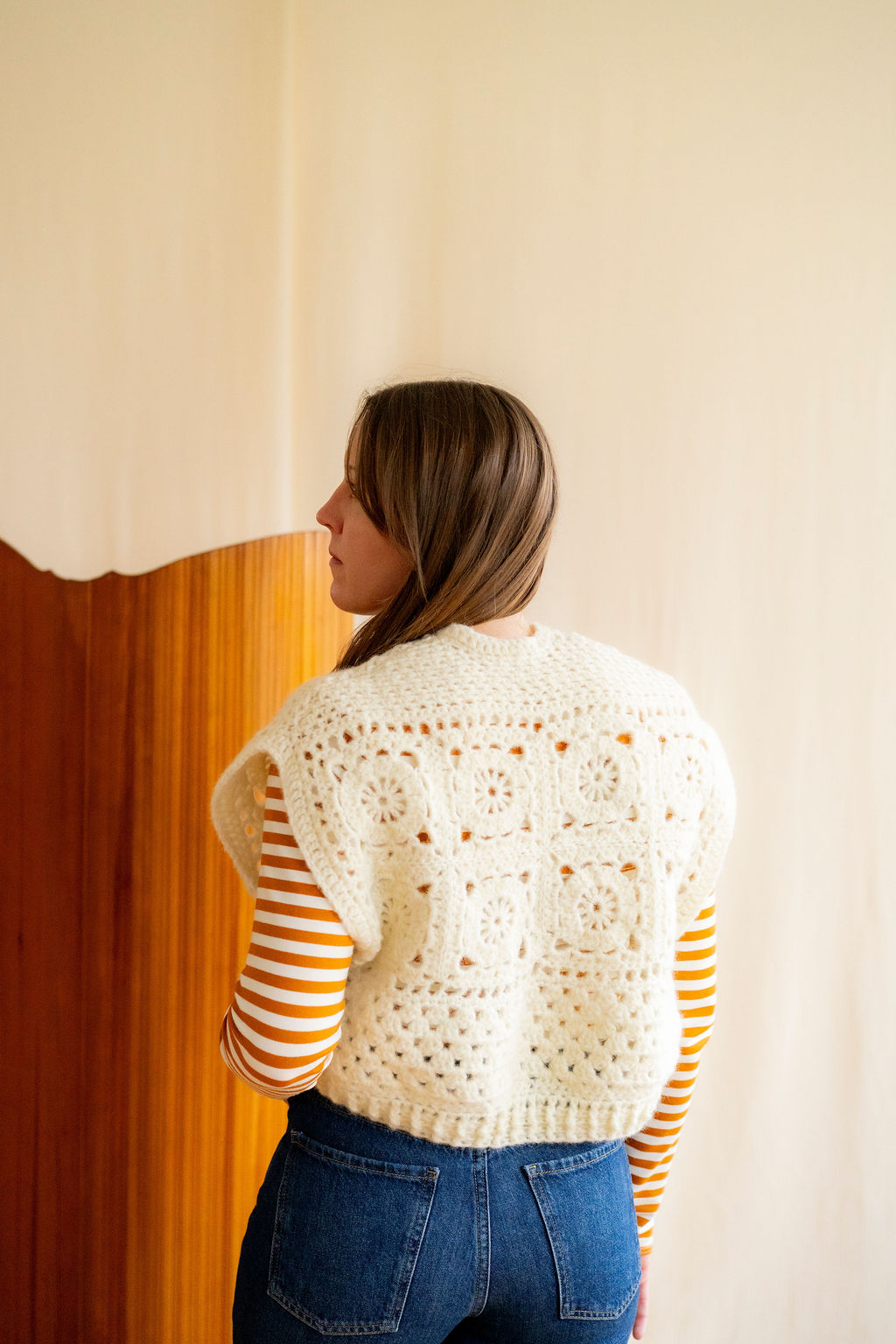 Le Kit Crochet – Gilet Basile permet de réaliser un gilet sans manche ample et court, à encolure ronde, combinant grannies et points variés, dans une laine épaisse, douce et facile à crocheter.