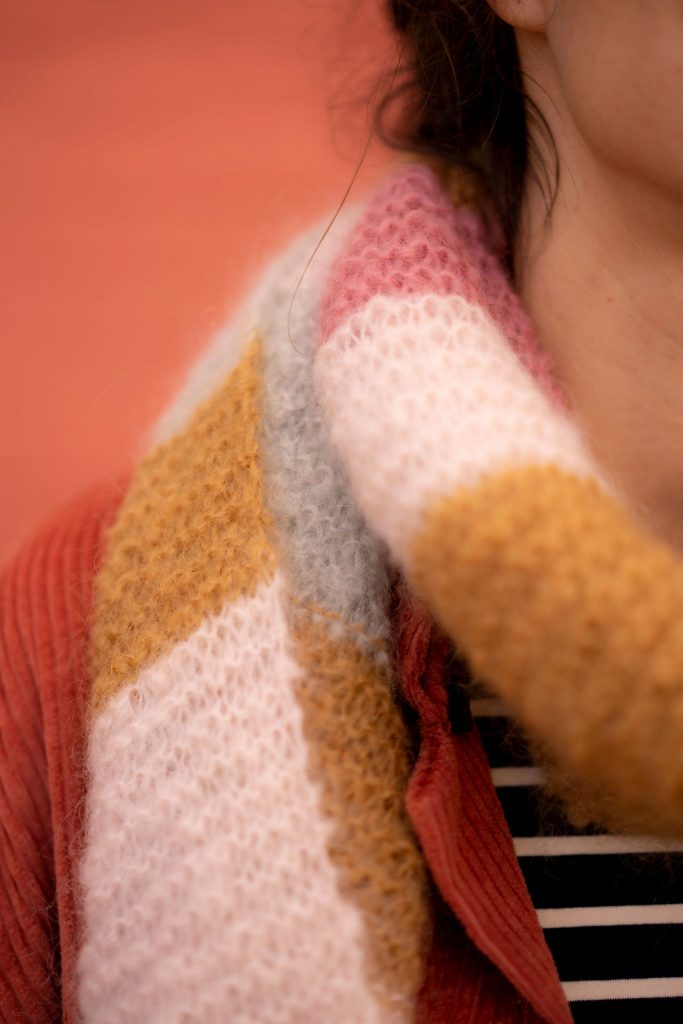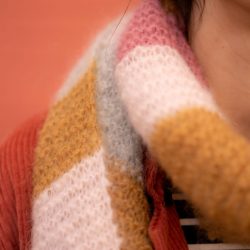 Vous pourrez vous amuser avec les 4 couleurs de pelotes ou même davantage si vous choisissez d’ajouter des pelotes en option. Un arc-en-ciel de douceur à enrouler autour de son cou…