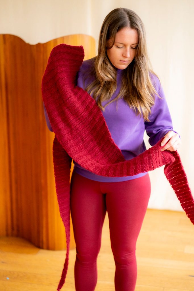 Avec ce kit, vous pourrez crocheter une loooooongue pointe triangulaire, très étirée, plutôt étroite et très dans l’air du temps.