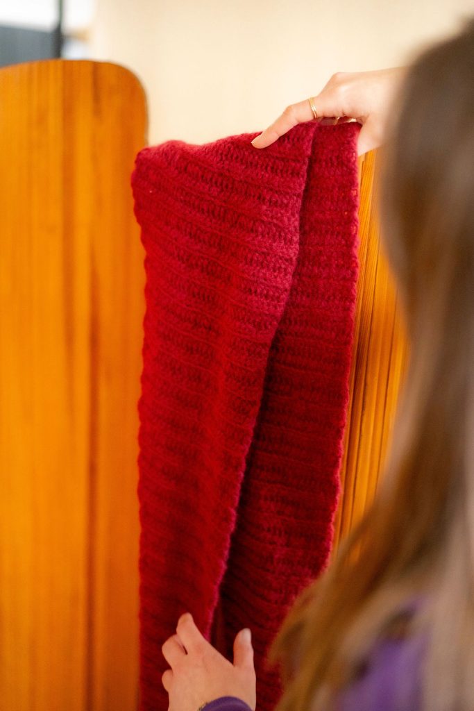 Le fil donne un rendu chaud et confortable — un vrai bonheur de s’enrouler dans cette longue pointe-écharpe