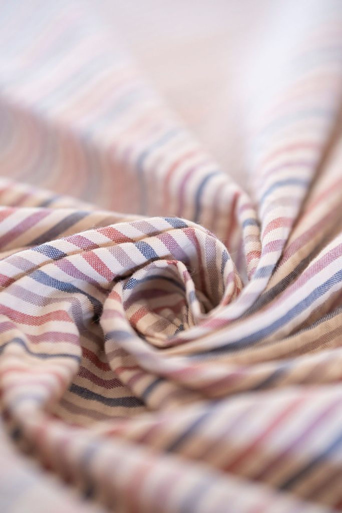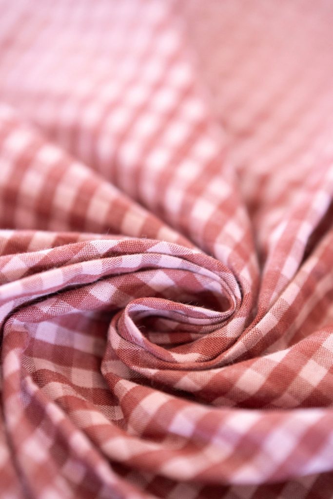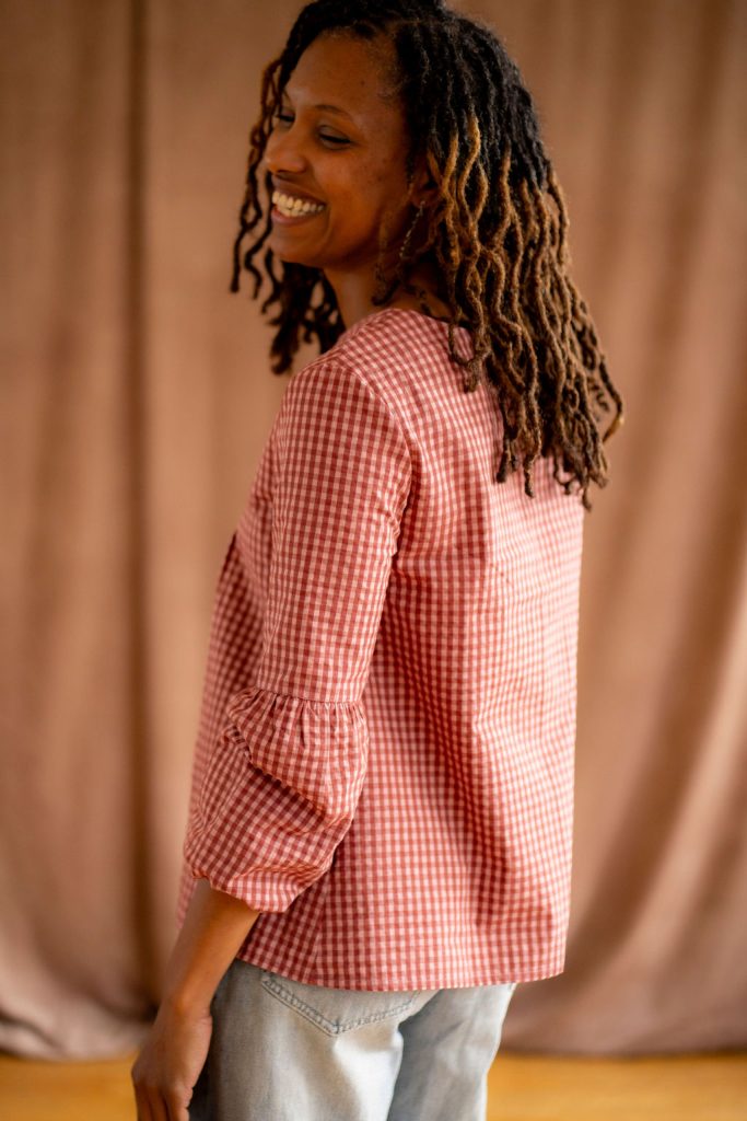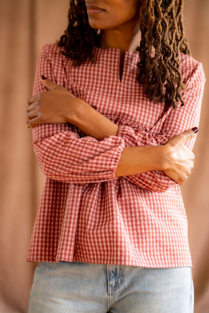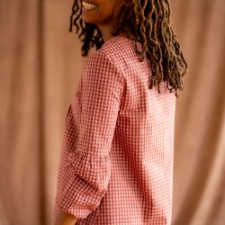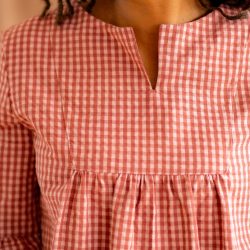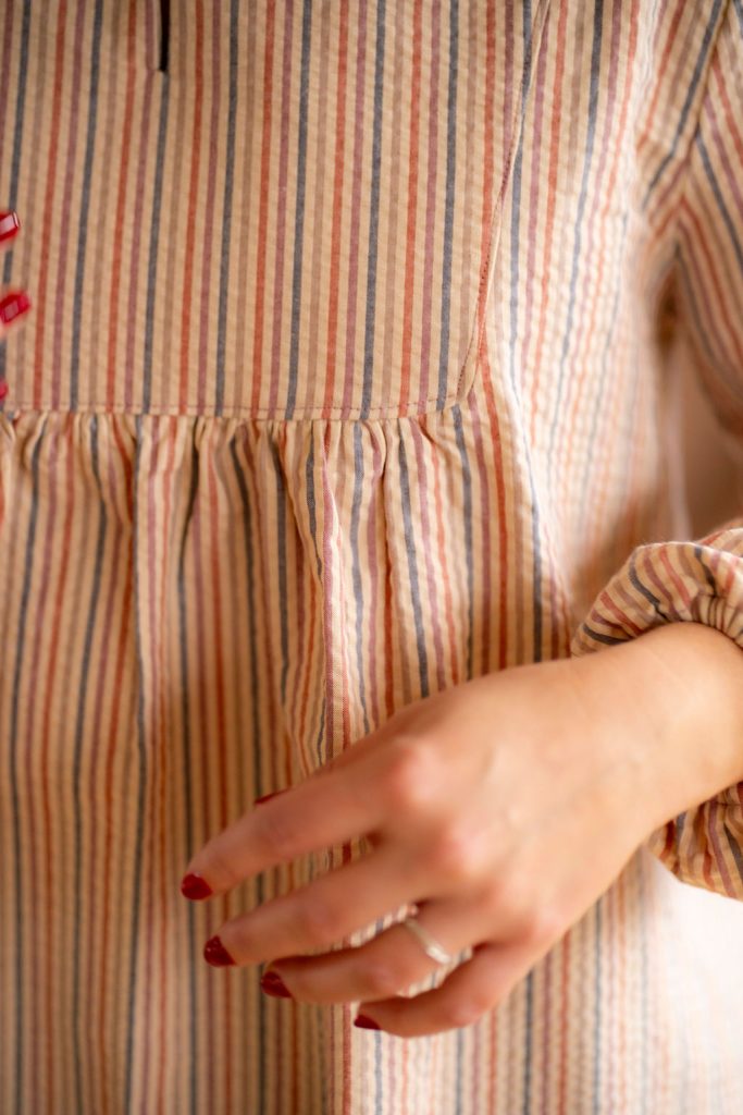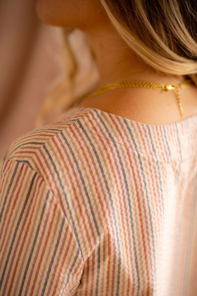 Le tissu seersucker à rayures ou vichy ton sur ton choisi pour cette collection la rend très agréable à porter et lui amène un joli tombé une fois que vous l’aurez enfilée.