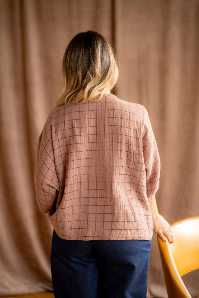 La double-gaze et la blouse Simone forment un duo qui fonctionne toujours très bien : le confort du tissu et le motif carreaux discret couleur praliné sont parfaits pour ce modèle !
