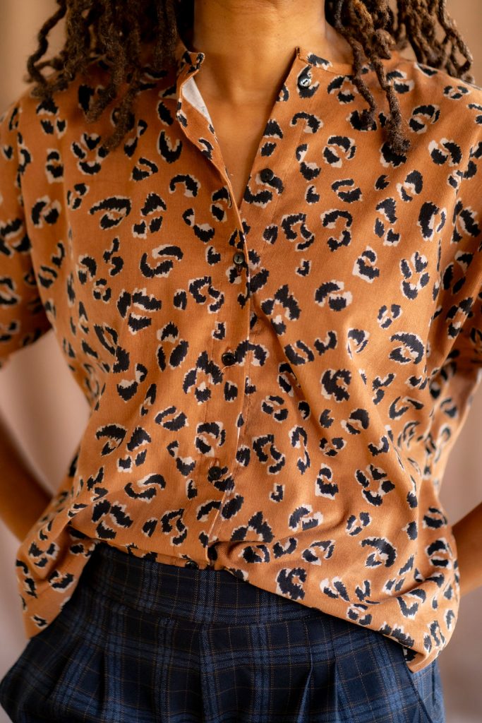 Le velours milleraies chemise fauve est parfait pour réaliser une Simone originale et facile à associer à la fois : avec du jean ou des couleurs vives, cet imprimé fonctionne très bien !