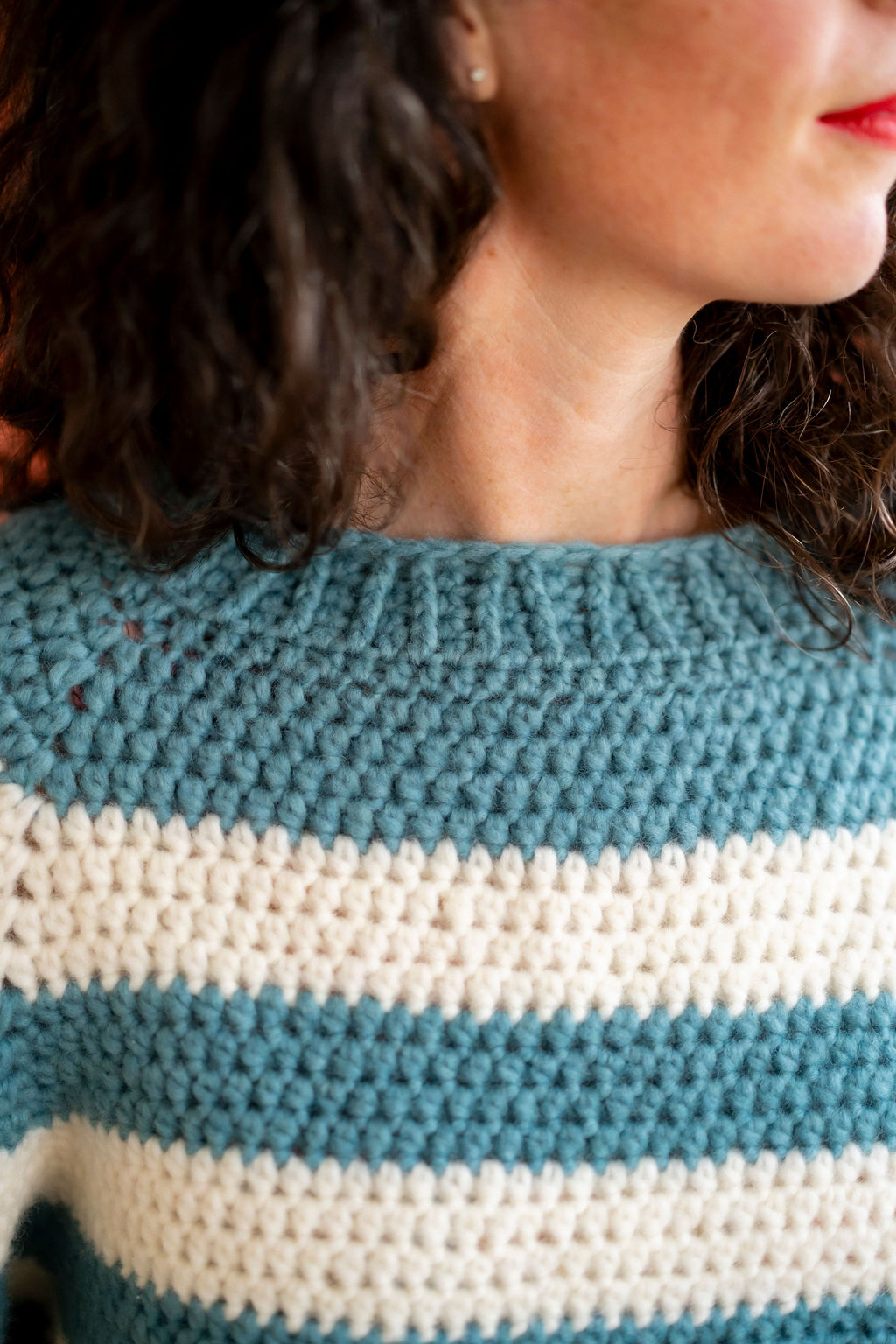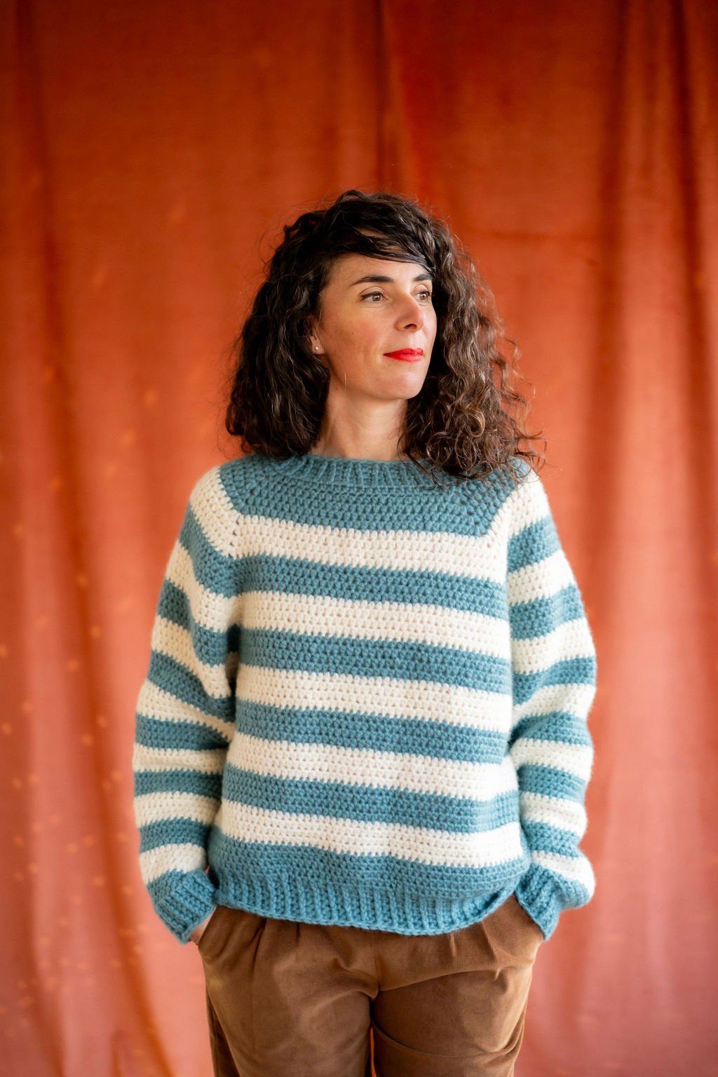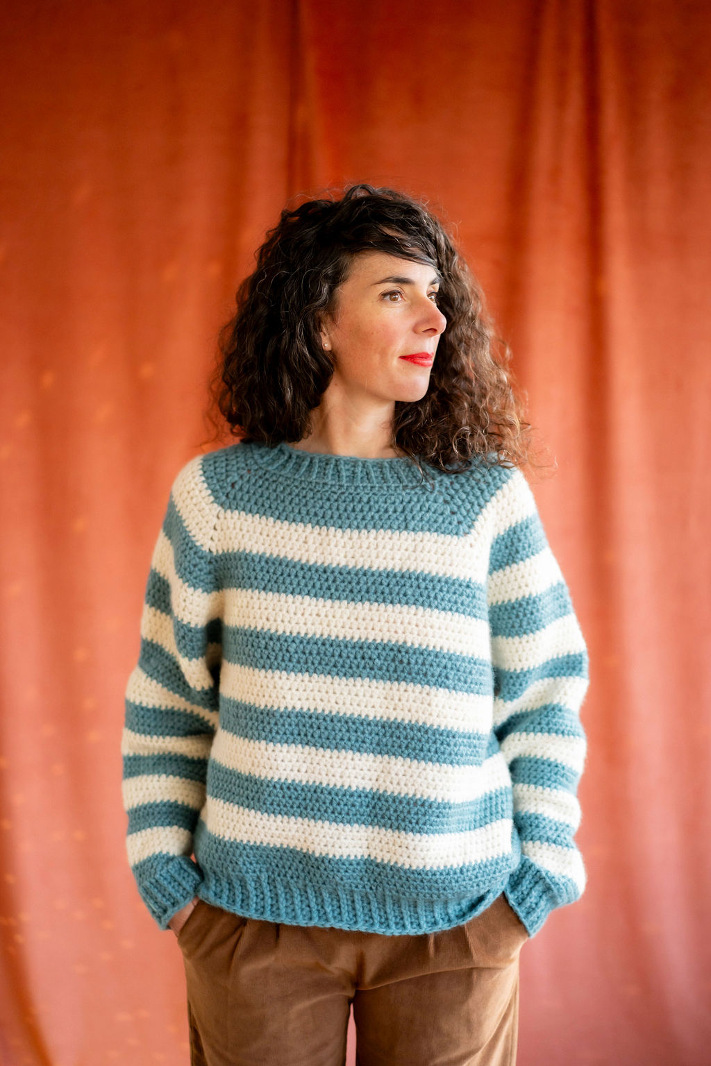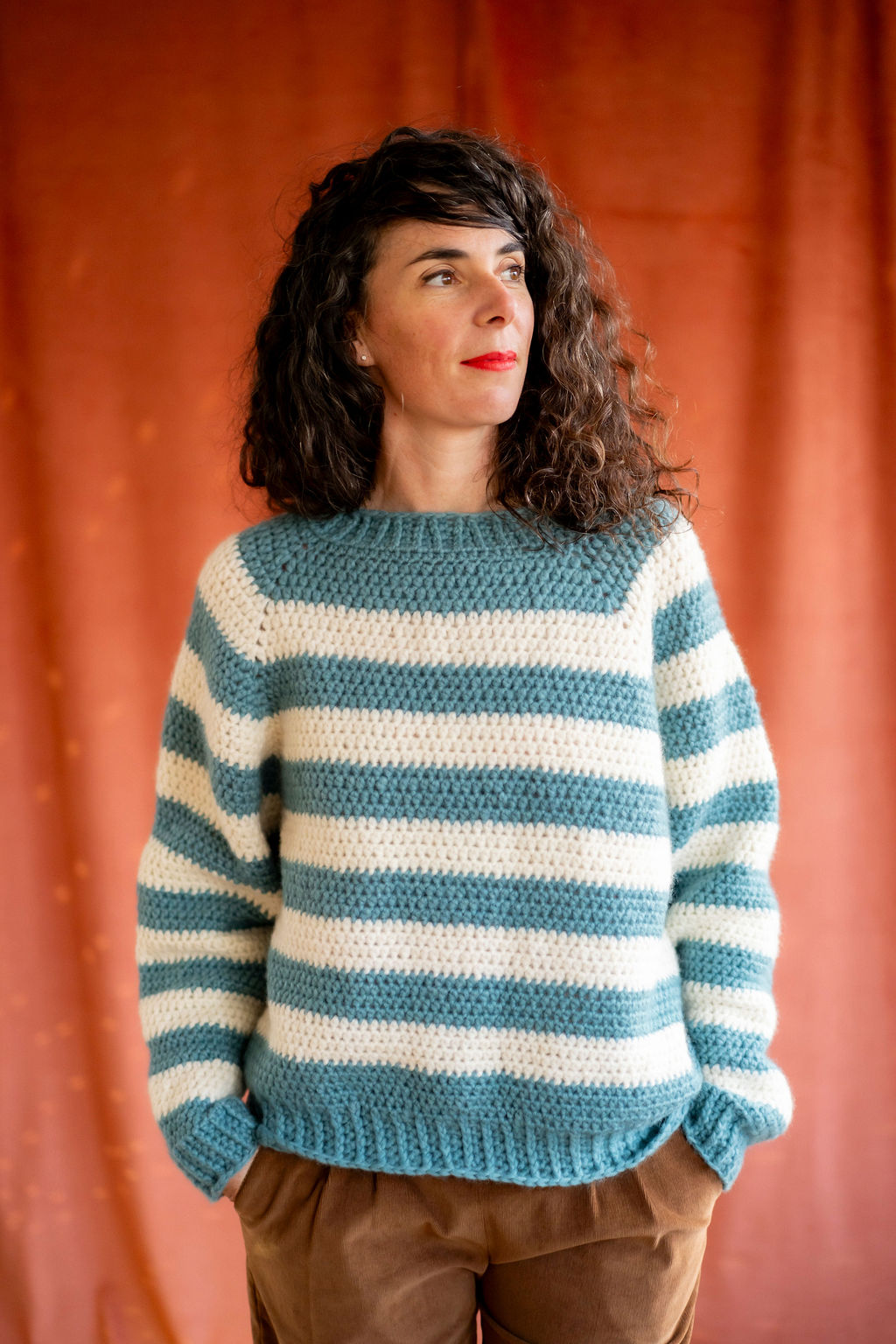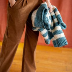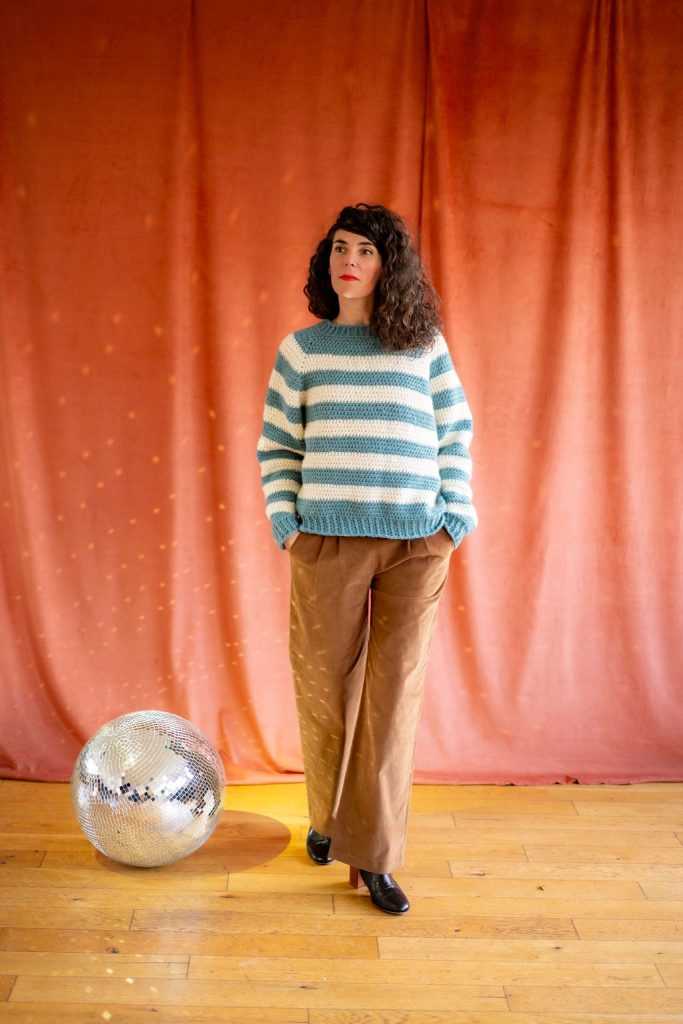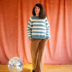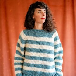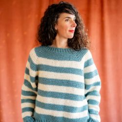 Avec ce kit, vous réaliserez le pull Julien, un pull rayé confortable, à encolure ronde, aux emmanchures amples et à la taille légèrement resserrée. C’est un pull plutôt court qui arrive mi-hanche.