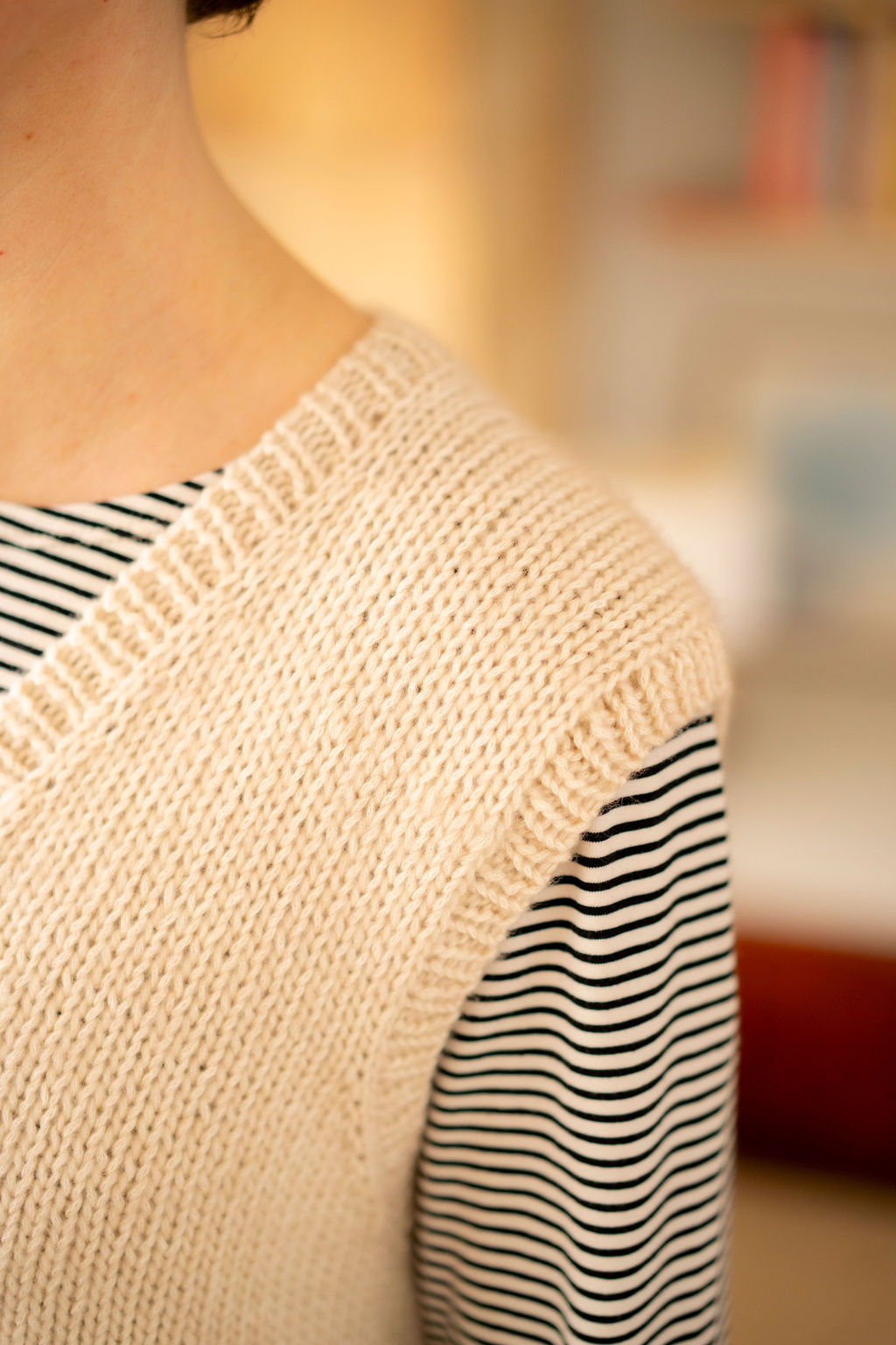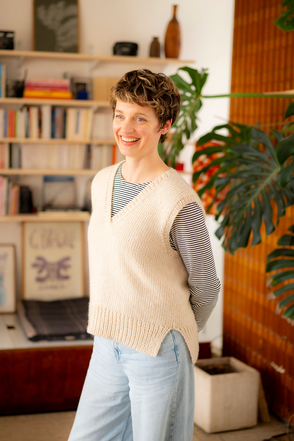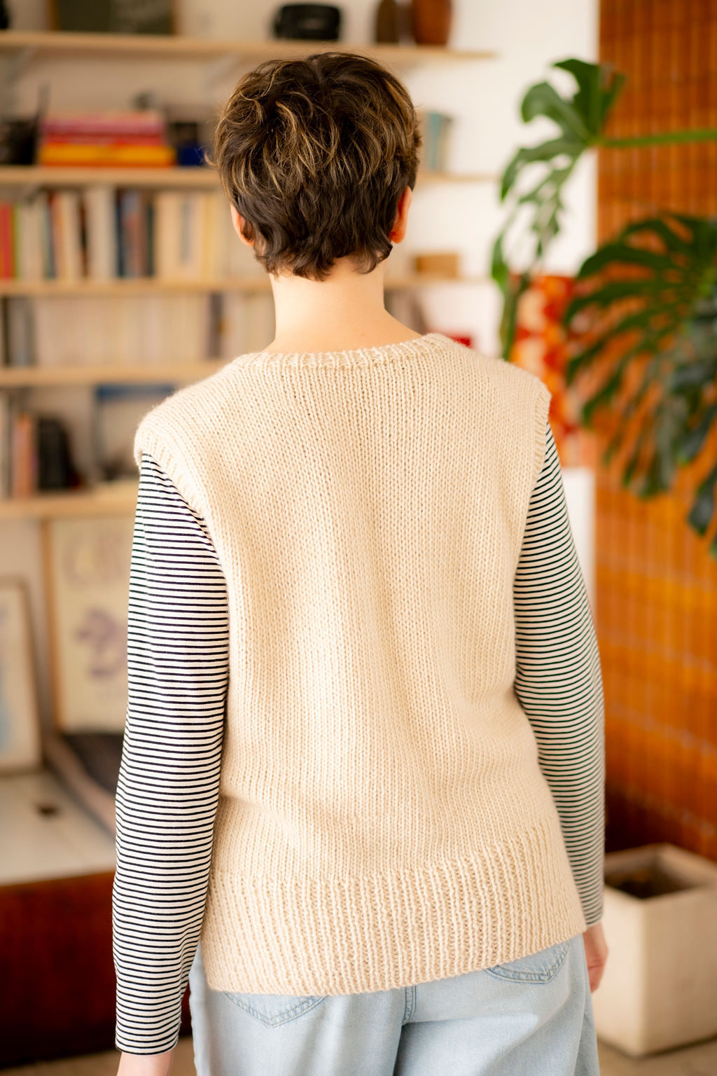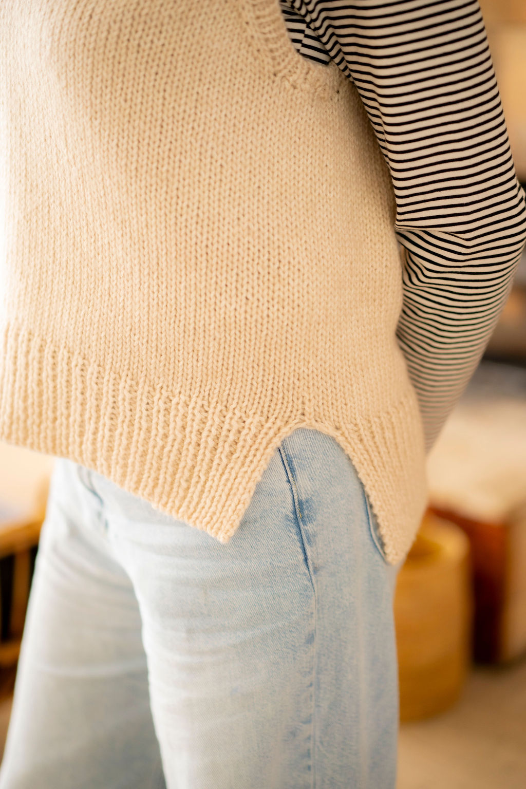 Igor est un petit pull sans manches, à l’encolure V et à la bordure côte fendue en bas, tricoté tout en jersey endroit dans ce fil chouchou qui mélange mérinos et coton, un fil ultra doux.
