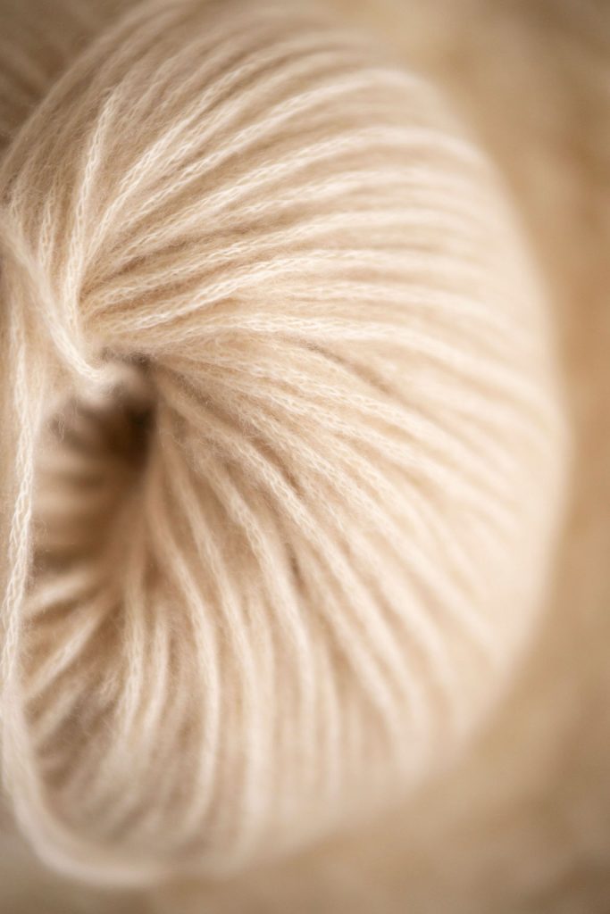 Zoom sur le fil utilisé : c’est un de nos fils préféré puisque nous le travaillons depuis une douzaine d’années. Il est très agréable à crocheter, ultra doux et mélange la laine et le coton ce qui fait de ce fil le parfait fil de mi-saison. Il un aspect légèrement chiné puisqu’il a une âme de fil de coton clair, ce qui en fait un fil lumineux. Il est très légèrement duveteux.
