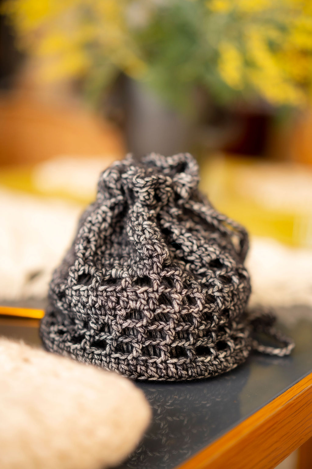 - L’aumônière au motif en grille – 1 pelote : un projet rapide et facile à réaliser. Elle se porte à l’épaule, et permet d’emporter un téléphone, un petit porte-monnaie, des lunettes de soleil et un chargeur par exemple, et apporte une touche romantique à une tenue casual. Elle peut aussi tenir lieu de petite pochette à ouvrage pour ranger une pelote en cours.