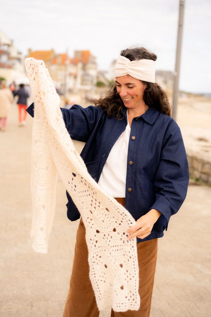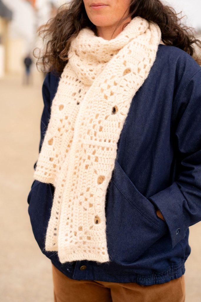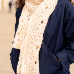 - Echarpe Ingrid : un nouveau granny monochrome « géant », graphique comme on les aime, que l’on duplique pour réaliser une écharpe à la fois intemporelle et stylée. Le fil s’y prête à merveille. On crochète les grannies soir après soir et à la fin de la semaine l’écharpe est terminée, elle est belle, on est trop contente de l’enrouler autour de son cou car elle apporte une touche romantique à une tenue casual en jean par exemple / 4,5 pelotes / Longueur 200 cm, largeur 30 cm